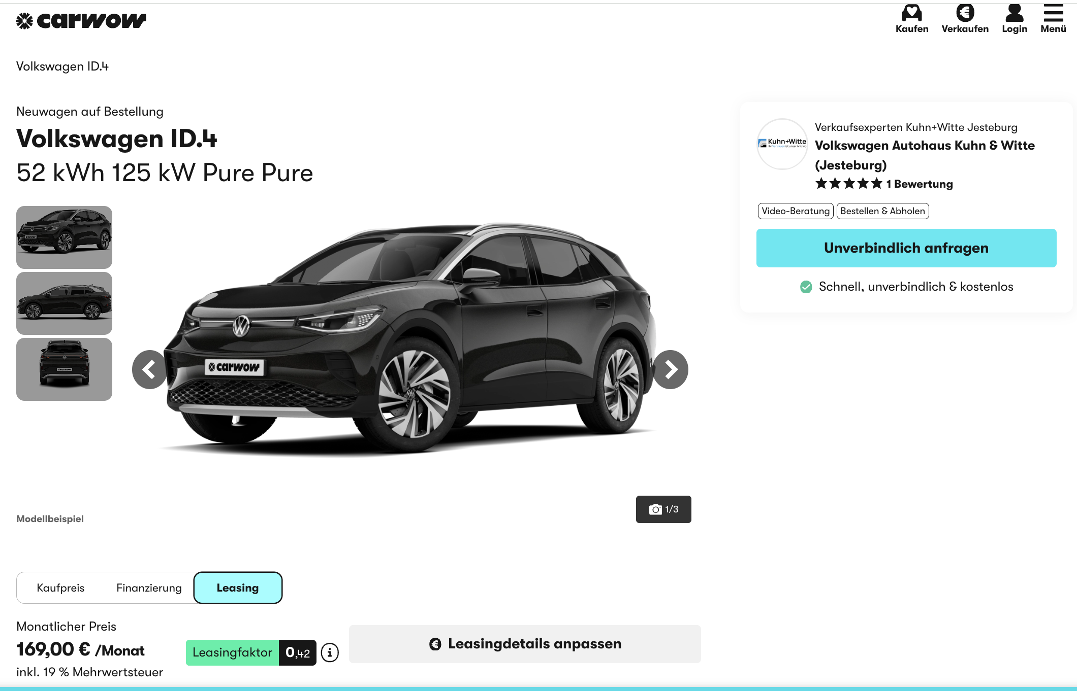 Auf der Suche nach einem gelungenen Elektro-VW zum günstigen Preis? Privatkunden leasen den VW ID.4 52 kWh 125 kW Pure bereits für 169 Euro brutto pro Monat bei carwow. Möglich wird die Rate durch die neue Umweltprämie, je nach Förderfähigkeit bewegt sich die normalisierte Rate zwischen 169 und 335,67 Euro. Bei voller Erstattung ergibt sich ein Leasingfaktor von 0,42! Alle Infos zur neuen E-Auto-Förderung findet ihr in unserem Ratgeber.