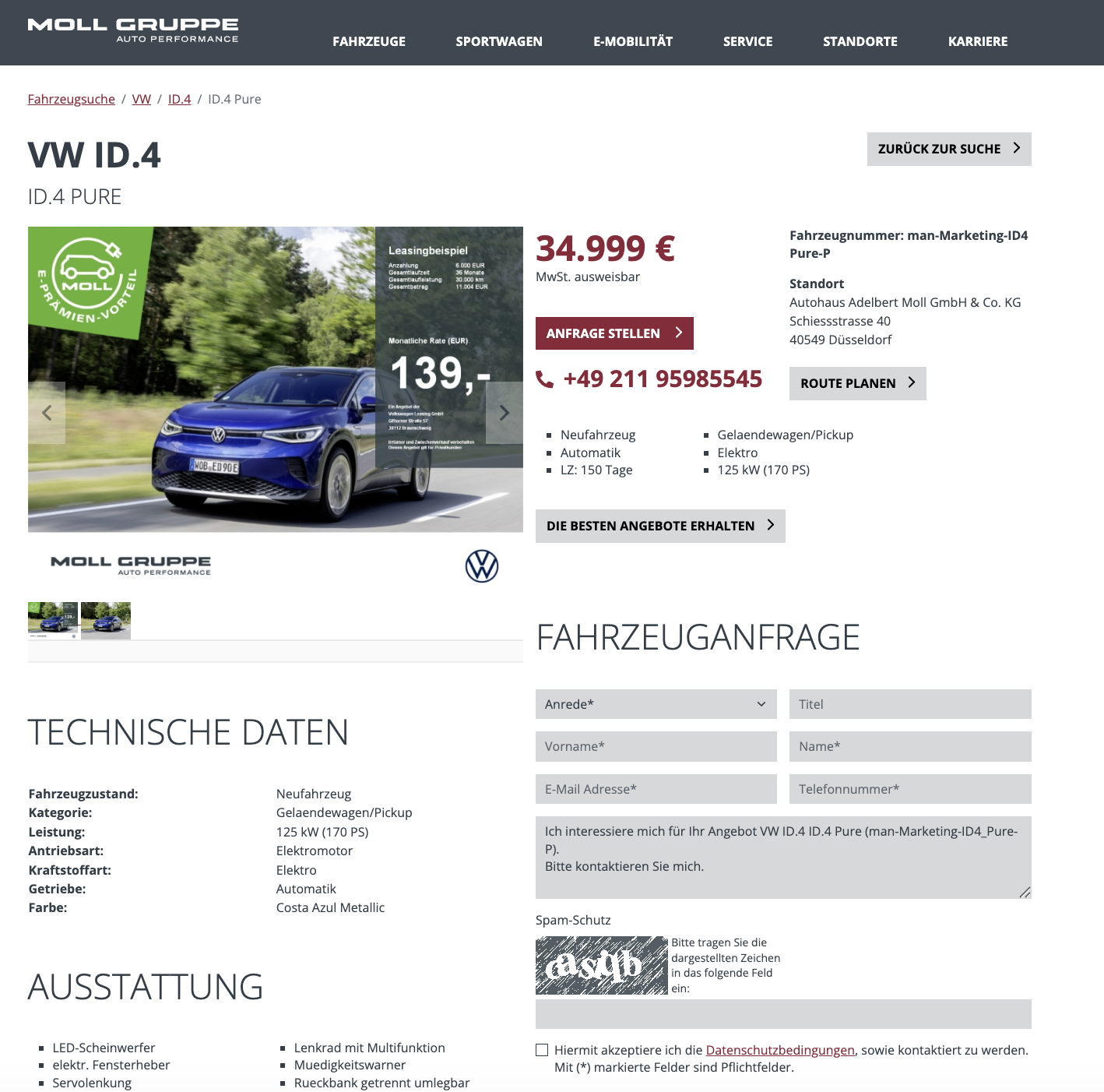 Berechnet ist das Angebot von Autohaus Moll mit 36 Monaten Laufzeit und 10.000 Kilometern pro Jahr, Anpassungen sind in der Regel möglich. Der Blick auf den Markt macht den Vorteil deutlich. Während andere Anbieter für einen vergleichbaren VW ID.4 mit gleicher Sonderzahlung rund 413 Euro brutto pro Monat verlangen, liegt dieses Angebot mit 139 Euro brutto weit darunter. Selbst unter Berücksichtigung der normalisierten Rate bleibt der Abstand klar sichtbar. Wer ein solides, alltagstaugliches Elektro-SUV sucht und Wert auf eine transparente Kalkulation legt, findet hier ein Angebot, das nüchtern betrachtet außergewöhnlich gut positioniert ist.