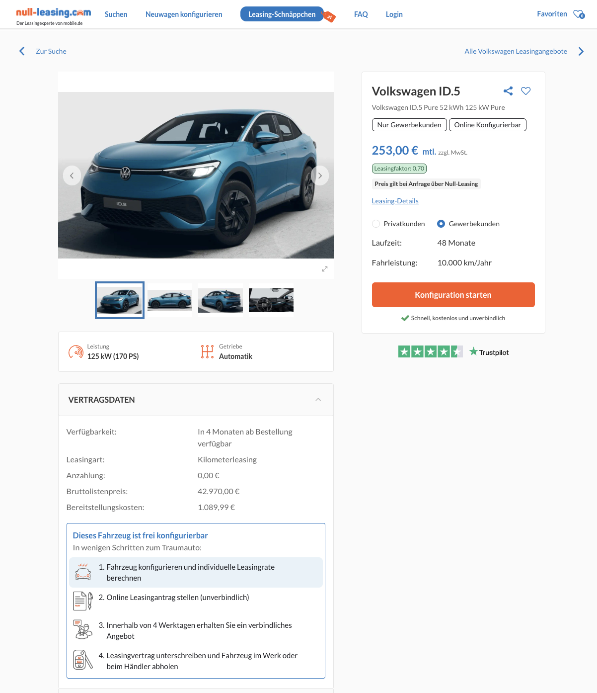 Kalkuliert ist das Geschäftsleasing bei Null-Leasing mit einer Laufzeit von 48 Monaten und 10.000 Kilometern pro Jahr, beides lässt sich bei Bedarf anpassen. Unterm Strich bleibt ein elektrisches SUV-Coupé, das modernes Design, alltagstaugliche Technik und einen ungewöhnlich fairen Monatsbetrag kombiniert. In dieser Preislage ist der VW ID.5 Pure schwer zu ignorieren.