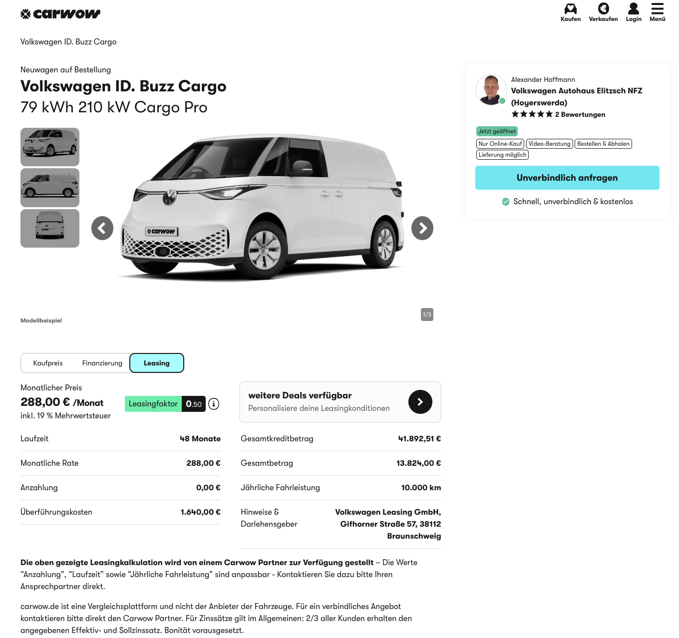Kalkuliert ist das Angebot mit 48 Monaten Laufzeit und 10.000 Kilometern pro Jahr. Der Vergleich macht den Deal besonders auffÀllig, denn beim Platzhirsch liegt ein VW ID.Buzz Cargo Pro laut Gegencheck bei 635 Euro brutto im Monat, also mehr als doppelt so hoch.