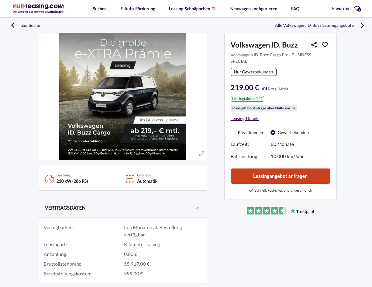 Der ID.Buzz Cargo bringt den Transporter ins Elektrozeitalter und bleibt dabei voll alltagstauglich. VW ID.Buzz Cargo Pro 79 kWh 210 kW bei Null-Leasing für 219 Euro netto im Monat setzt genau hier an und kombiniert moderne Technik mit einer Rate, die im Marktvergleich auffällt. Der Deal kommt ohne Sonderzahlung und präsentiert sich mit einem attraktiven Leasingfaktor von 0,47. Es handelt sich um ein frei konfigurierbares Bestellfahrzeug mit rund fünf Monaten Lieferzeit.