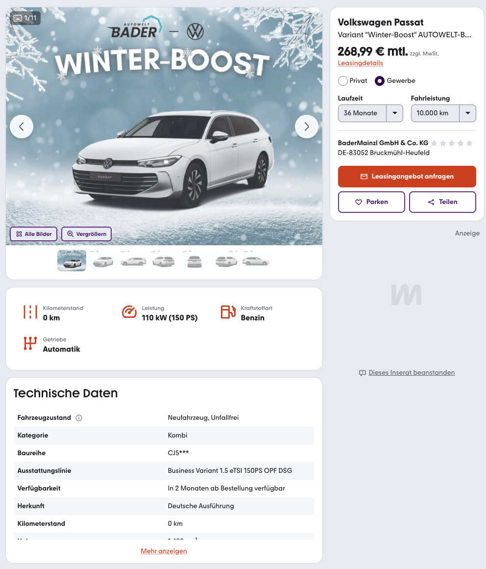 Ein Kombi für alle, die viel Platz brauchen und trotzdem nicht auf moderne Technik verzichten wollen. Bei mobile.de gibt es den VW Passat 1.5 eTSI OPF DSG Business im Geschäftsleasing für 269 Euro netto im Monat, ein frei konfigurierbares Bestellfahrzeug mit rund zwei bis drei Monaten Lieferzeit. Eine Metallic-Lackierung nach Wahl gibt es bereits ab etwa 9 Euro im Monat, das Winter Paket mit Sitzheizung liegt bei rund 7 Euro im Monat und macht den Passat ganzjährig fuhrparktauglich.