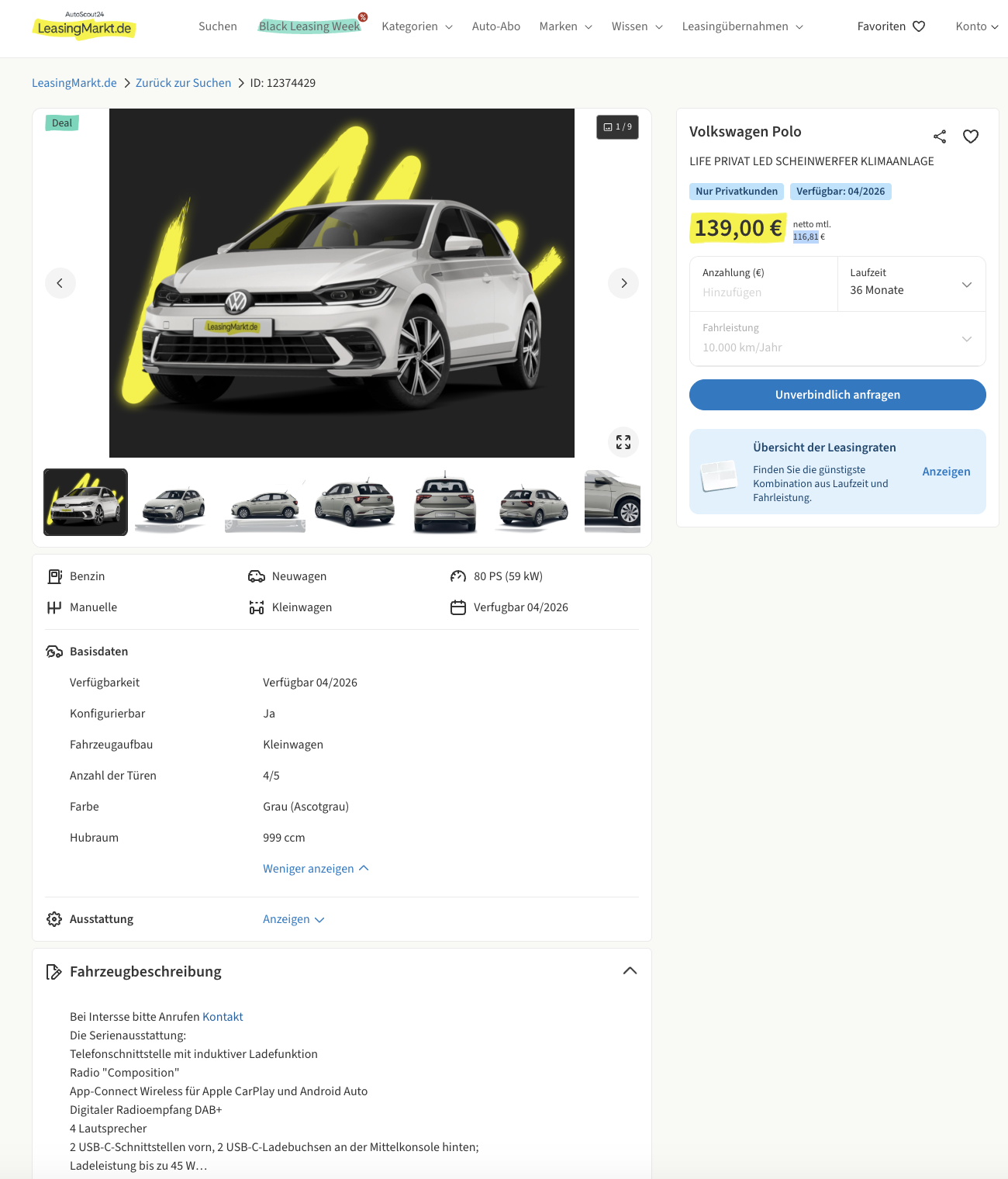 Das Black-Leasing Angebot ist schlank strukturiert, 36 Monate, 10.000 Kilometer pro Jahr, fertig. Spannend wird es im Vergleich, denn während der Marktführer für den identisch motorisierten Polo Life aktuell rund 238 Euro brutto im Monat aufruft, stehen bei LeasingMarkt 139 Euro brutto auf dem Zettel. Ihr spart also knapp 100 Euro im Monat, Geld, das direkt in Sonderlackierung, Komfortpaket oder einfach in andere Dinge im Alltag fließen kann.