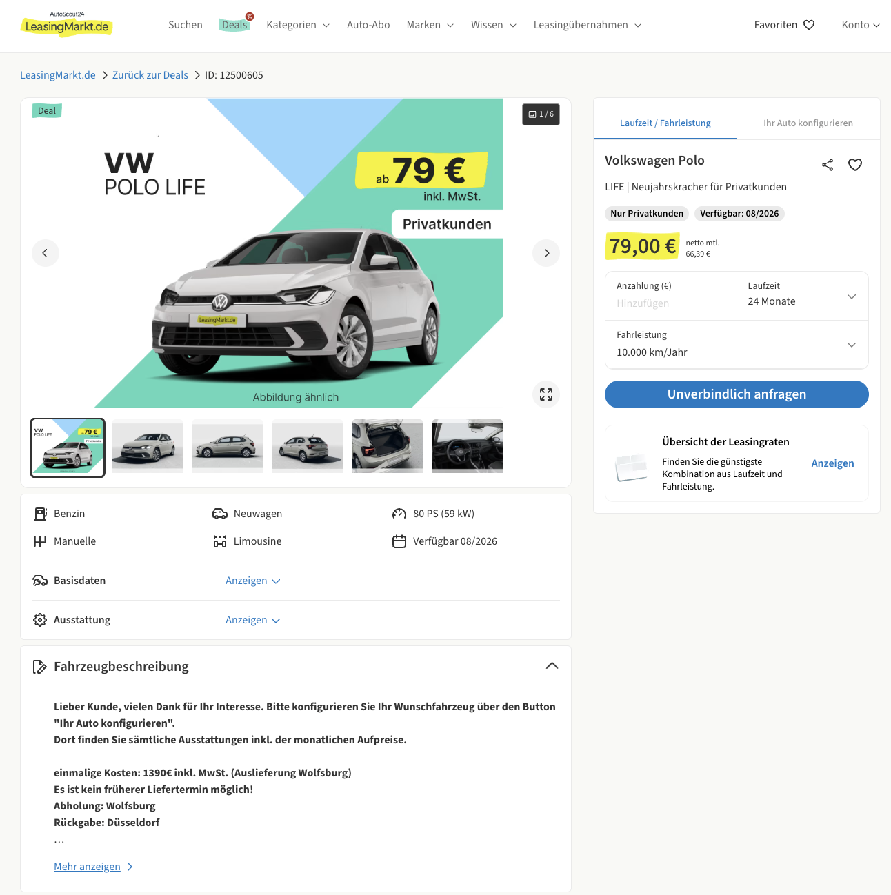 Kalkuliert ist das Angebot auf 24 Monate und 10.000 Kilometer pro Jahr. Der entscheidende Punkt bleibt jedoch die Monatsrate, denn 79 Euro brutto sind ein Preis, der den Polo wieder zu dem macht, was er immer sein sollte, ein unkomplizierter Allrounder, der im Budget kaum auffällt, aber im Alltag zuverlässig mitläuft. Zum Vergleich: Der Marktführer ruft für den Polo aktuell 303 Euro brutto pro Monat auf, also deutlich mehr als das Dreifache. Genau deshalb ist dieses Angebot so auffällig, es zieht den Polo wieder in die Preisklasse zurück, in der viele ihn auch haben wollen.