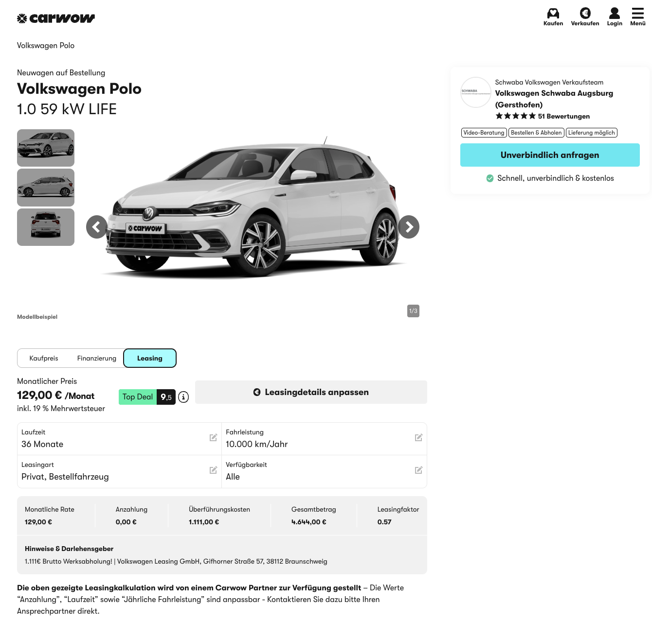 Kompakt, vertraut und genau deshalb so beliebt. Privatkunden können den VW Polo 1.0 59 kW Life bei carwow für 129 Euro brutto pro Monat leasen. Angeboten wird er als frei konfigurierbares Bestellfahrzeug, wodurch Farbe, Ausstattung und Details nach eigenen Vorstellungen gewählt werden können. Mit einer Lieferzeit von rund vier Monaten bleibt das Ganze realistisch planbar.