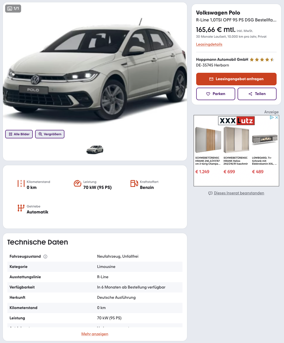 Der Polo gehört seit Jahren zu den festen Größen im Kleinwagensegment von Volkswagen. Privatkunden können den VW Polo 1.0 TSI 85 kW DSG R-Line aktuell bei mobile.de für 165,55 Euro im Monat brutto leasen, ein Schnäppchen, wenn man Bedenkt, das der Platzhirsch 331 Euro brutto für den gleichen Polo aufruft. Das Angebot richtet sich an Privatkunden und basiert auf einem frei konfigurierbaren Bestellfahrzeug, Farbe, Ausstattung und Pakete lassen sich also individuell zusammenstellen. Die Lieferzeit liegt bei rund sechs Monaten.