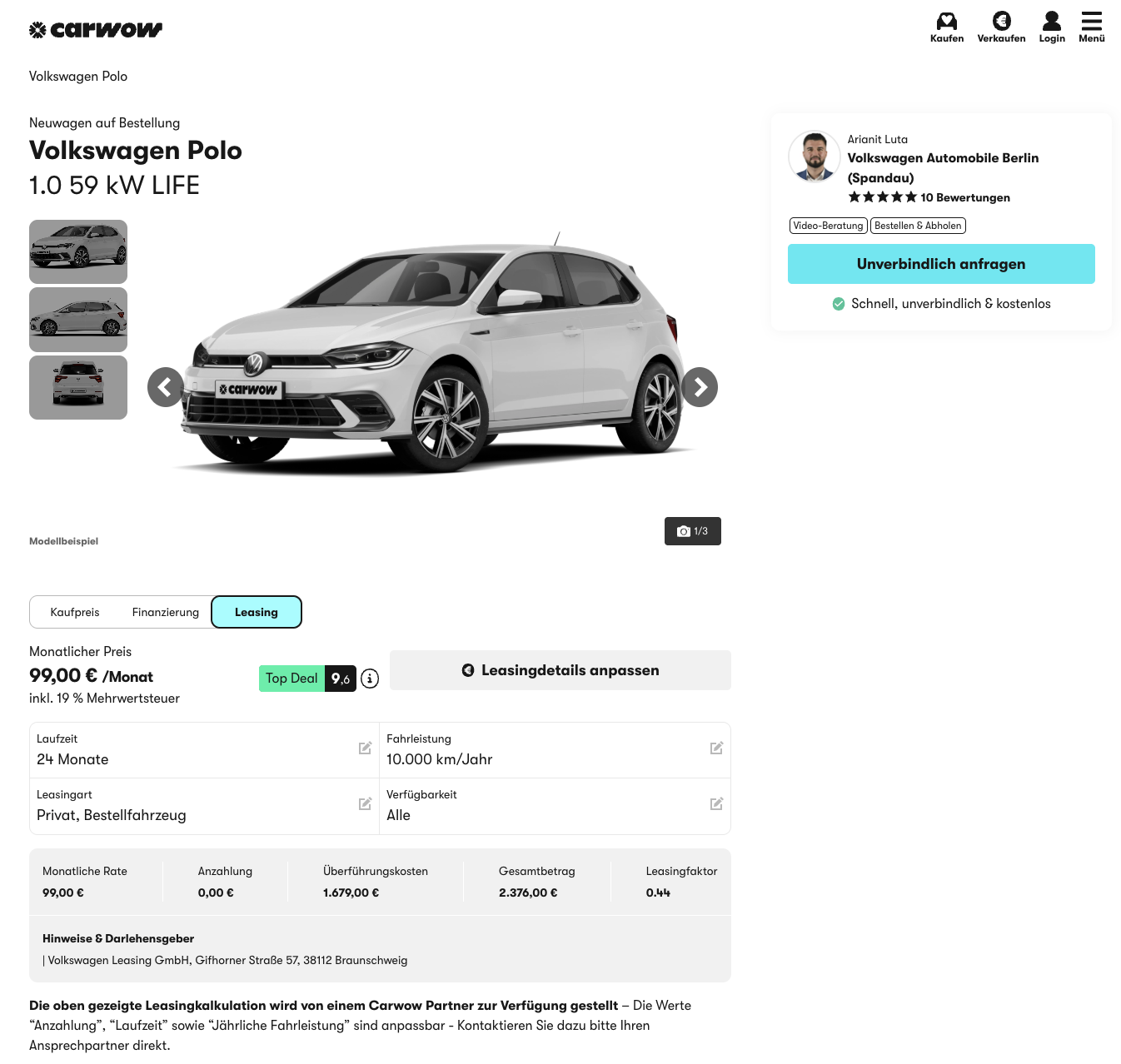 Der VW Polo ist die vernĂŒnftige Seite von Volkswagen, kompakt, vertraut, alltagssicher. Privatkunden können den VW Polo 1.0 59 kW Life aktuell bei carwow fĂŒr 99 Euro brutto im Monat leasen, das entspricht einen Leaingfaktor von 0,44. Dabei handelt es sich um ein frei konfigurierbares Bestellfahrzeug mit rund vier Monaten Lieferzeit. Somit könnt ihr das Fahrzeug nach euren WĂŒnschen zusammenstellen, ob Farbe oder Ausstattungspakete, ihr entscheidet, was reinkommt.