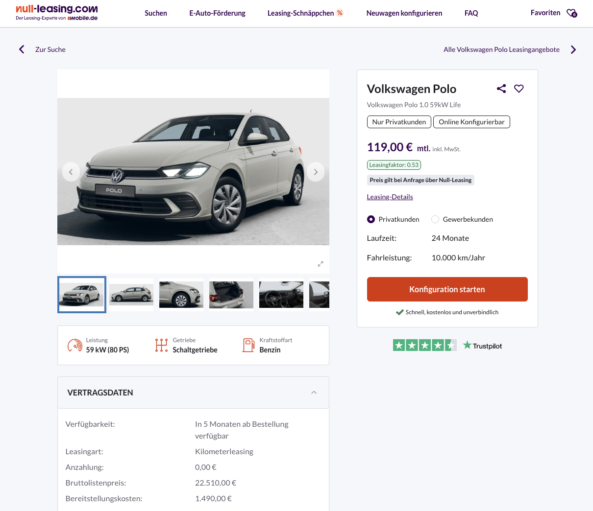 Der VW Polo ist kein Hype Auto, sondern ein Dauerläufer, der Tag für Tag abliefert. Privatkunden können bei Null-Leaisng zuschlagen und den VW Polo 1.0 59 kW Life für 119 Euro brutto pro Monat leasen und zwar als frei konfigurierbares Bestellfahrzeug. Wer Farbe, Felgen oder Extras passend zum eigenen Alltag wählen will, bekommt hier die nötige Freiheit. Die Lieferzeit liegt bei rund fünf Monaten, also planbar, aber eben nicht spontan vom Hof.