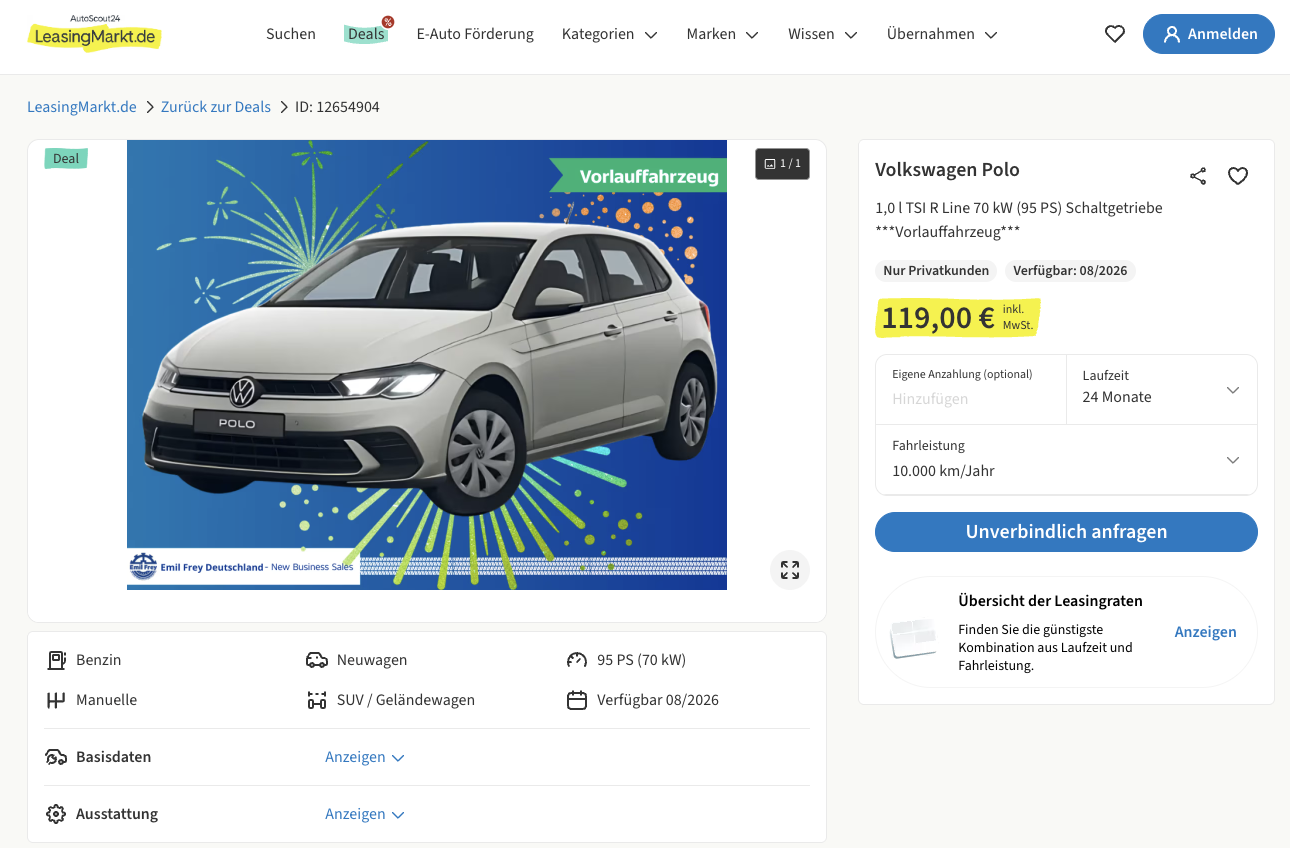 Die Rechnung basiert auf 24 Monaten Laufzeit und 10.000 Kilometern pro Jahr. Doch am Ende bleibt vor allem eines hĂ€ngen, 119 Euro brutto im Monat fĂŒr einen VW Polo R-Line sind aktuell schlicht ein sehr gĂŒnstiger Einstieg. Genau deshalb gehört dieses Angebot zu den Deals, die nicht lange erklĂ€rt werden mĂŒssen. Der Preis erledigt einen groĂen Teil der Argumentation schon allein.