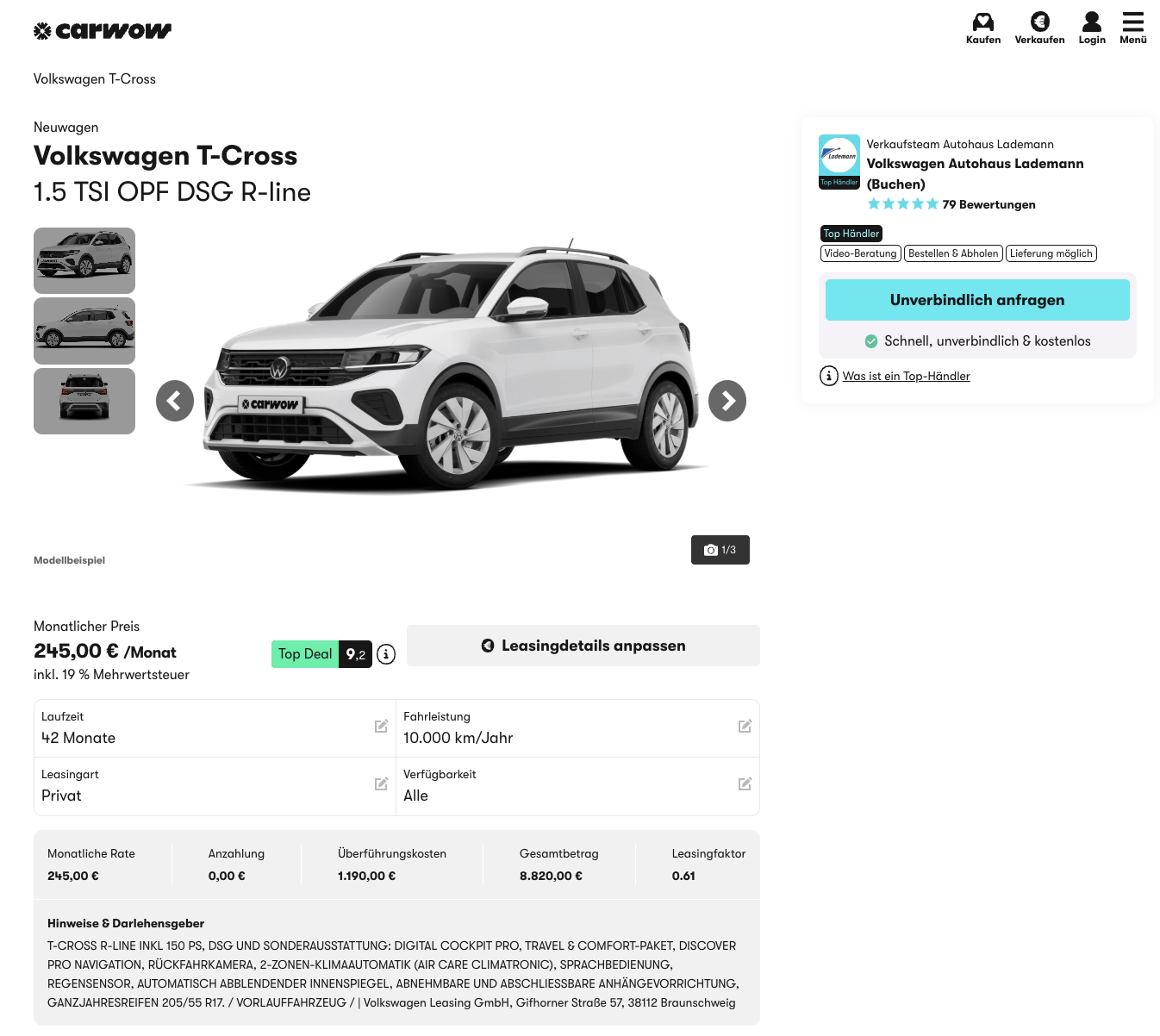 Das Angebot ist mit 42 Monaten Laufzeit und 10.000 Kilometern pro Jahr kalkuliert, Anpassungen sind möglich. Während für einen vergleichbar ausgestatteten T-Cross teils rund 394 Euro brutto pro Monat verlangt werden, liegt dieses Angebot mit 245 Euro brutto deutlich darunter.