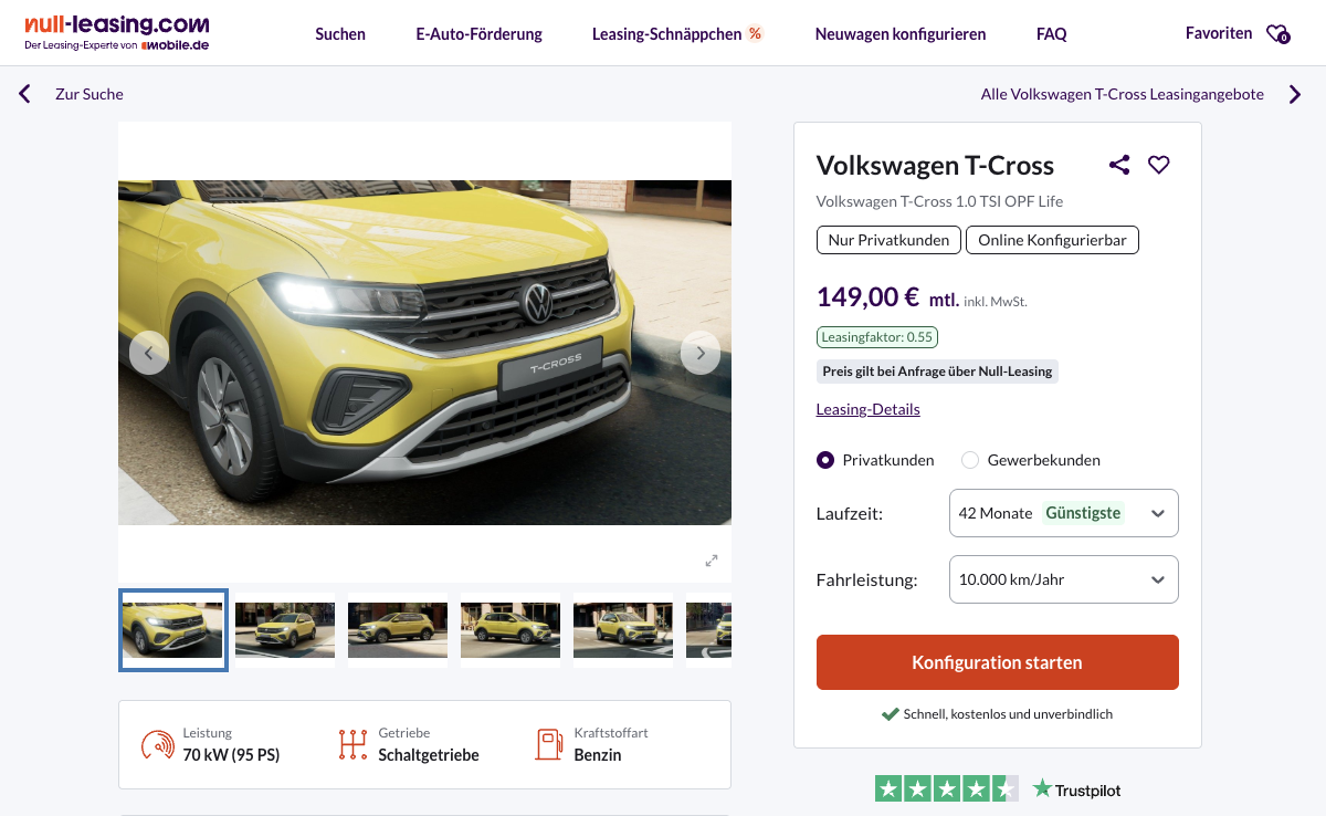 Das Leasing ist auf 42 Monate Laufzeit und 10.000 Kilometer pro Jahr ausgelegt, Anpassungen sind möglich. Besonders stark wirkt das Angebot im direkten Vergleich. Während ähnliche Modelle beim Marktführer aktuell bei rund 283 Euro monatlich liegen, bleibt dieser T-Cross mit 149 Euro brutto deutlich darunter. Genau diese Differenz macht den Deal aktuell besonders interessant für alle, die ein vielseitiges SUV zu einem fair kalkulierten Preis suchen.