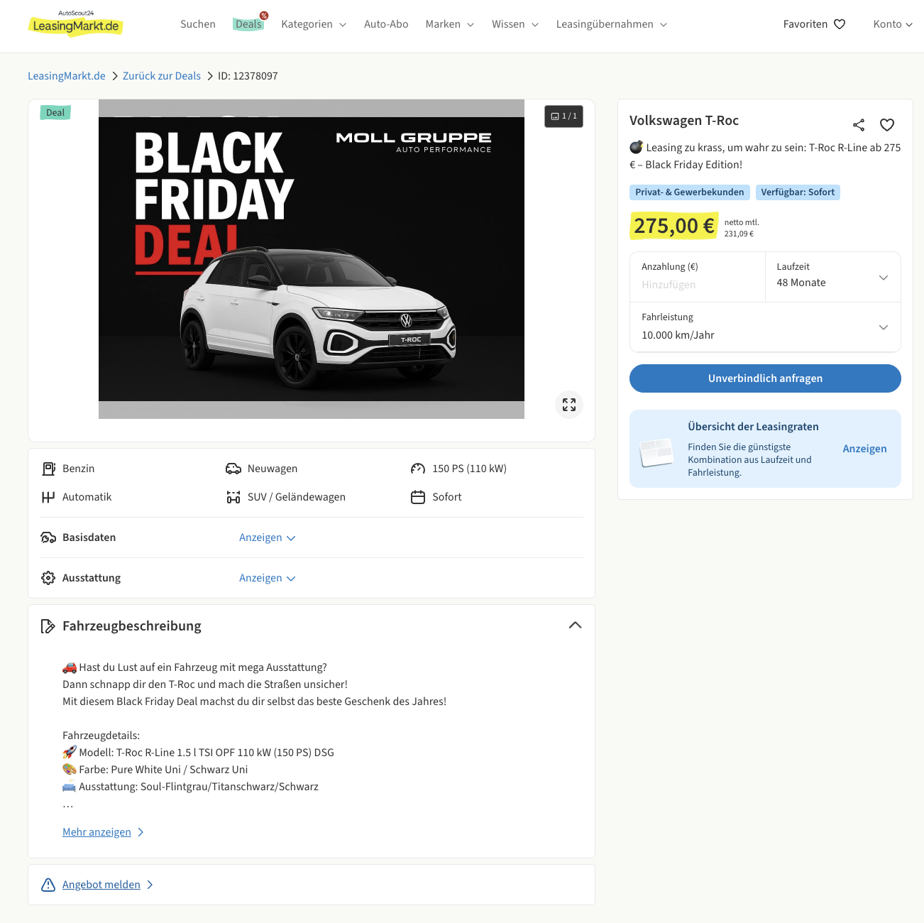 Die Kalkulation liegt bei 48 Monaten Laufzeit und 10.000 Kilometern pro Jahr, andere Profile sind in der Regel anpassbar. Unterm Strich gibt es hier einen sportlichen T-Roc R-Line mit Black Style Paket als sofort verfügbaren Lagerwagen, klar bepreist, gut ausgestattet und bereit für alle, die ein kompaktes SUV mit etwas mehr Haltung als den Standard suchen.