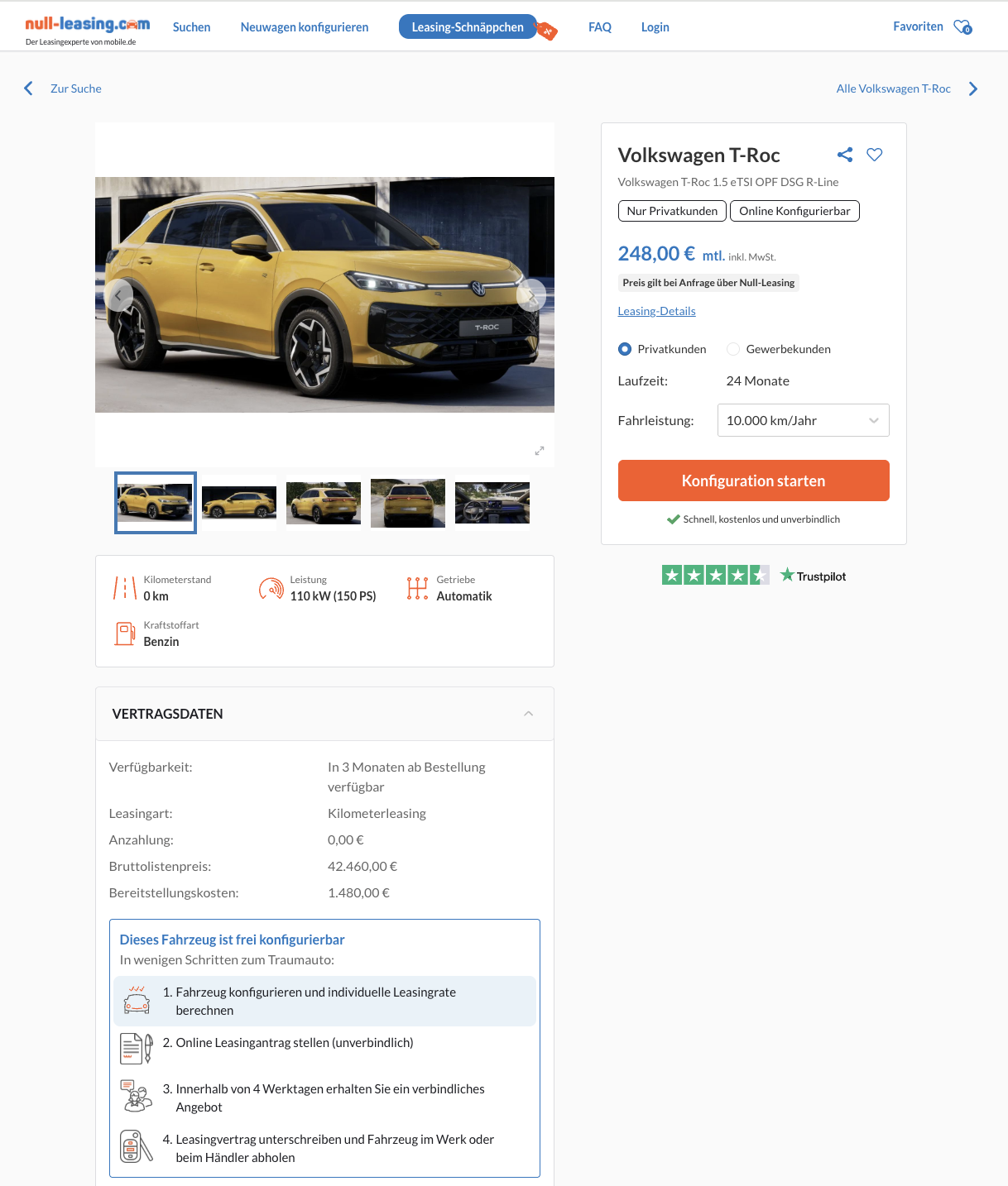 Kompaktes SUV mit richtig viel R-Line Attitüde. Gemeint ist der VW T-Roc 1.5 eTSI 110 kW DSG R-Line, den Privatkunden bei Null-Leasing für 248 Euro brutto im Monat leasen können. Dabei handelt es sich um ein frei konfigurierbares Bestellfahrzeug, Lack, Räder, Interieur und Ausstattungspakete legt ihr selbst fest, die Lieferzeit liegt bei rund drei Monaten.