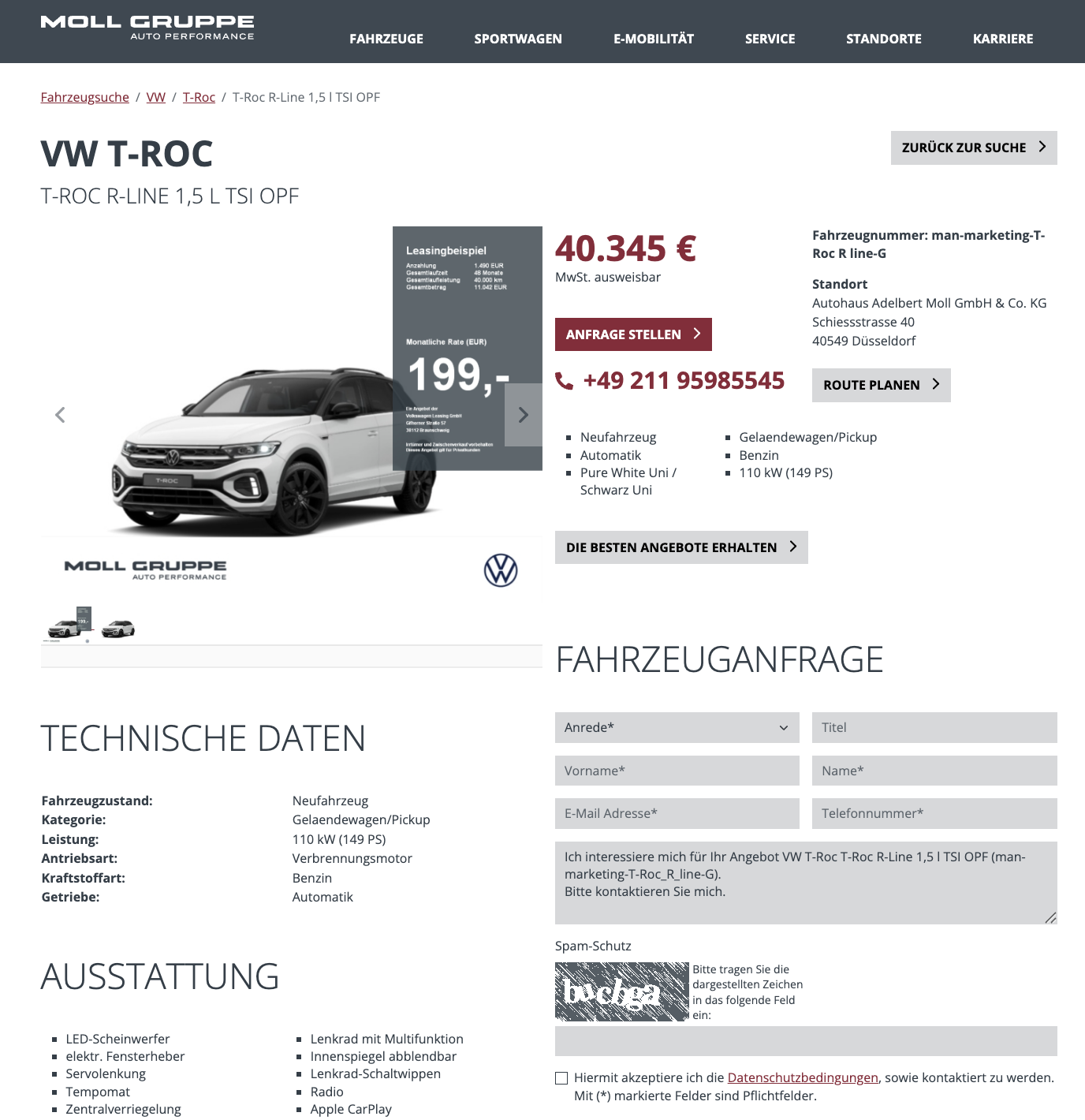 Wer sich mit dem neuen T-Roc schwertut, bekommt beim Autohaus Moll genau das Gegenprogramm. Der VW T-Roc 1.5 TSI 110 kW DSG R-Line als Vorfacelift-Modell steht dort im Geschäftsleasing für 199 Euro netto im Monat bereit, bei 1.450 Euro Sonderzahlung. Privatkundensteigen für 279 Euro brutto ein, ebenfalls mit 1.450 Euro Anzahlung.