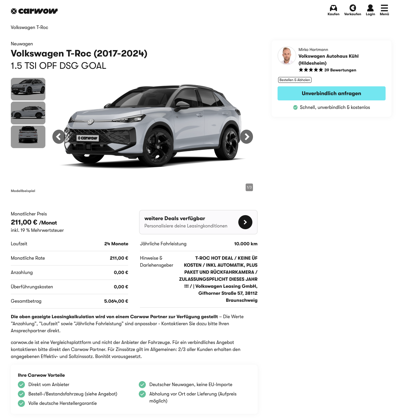 Die Kalkulation bei carwow liegt bei 24 Monaten Laufzeit und 10.000 Kilometern pro Jahr, andere Parameter lassen sich in der Regel anpassen, wenn der Fahralltag mehr oder weniger Strecke vorsieht. Mit 211 Euro brutto im Monat, sofort verfügbarer GOAL Edition, entfallenden Überführungskosten und Zulassung im Jahr 2025 wird der VW T-Roc zu einem Angebot, das den Einstieg ins kompakte SUV Segment preislich überschaubar und technisch sehr solide macht.