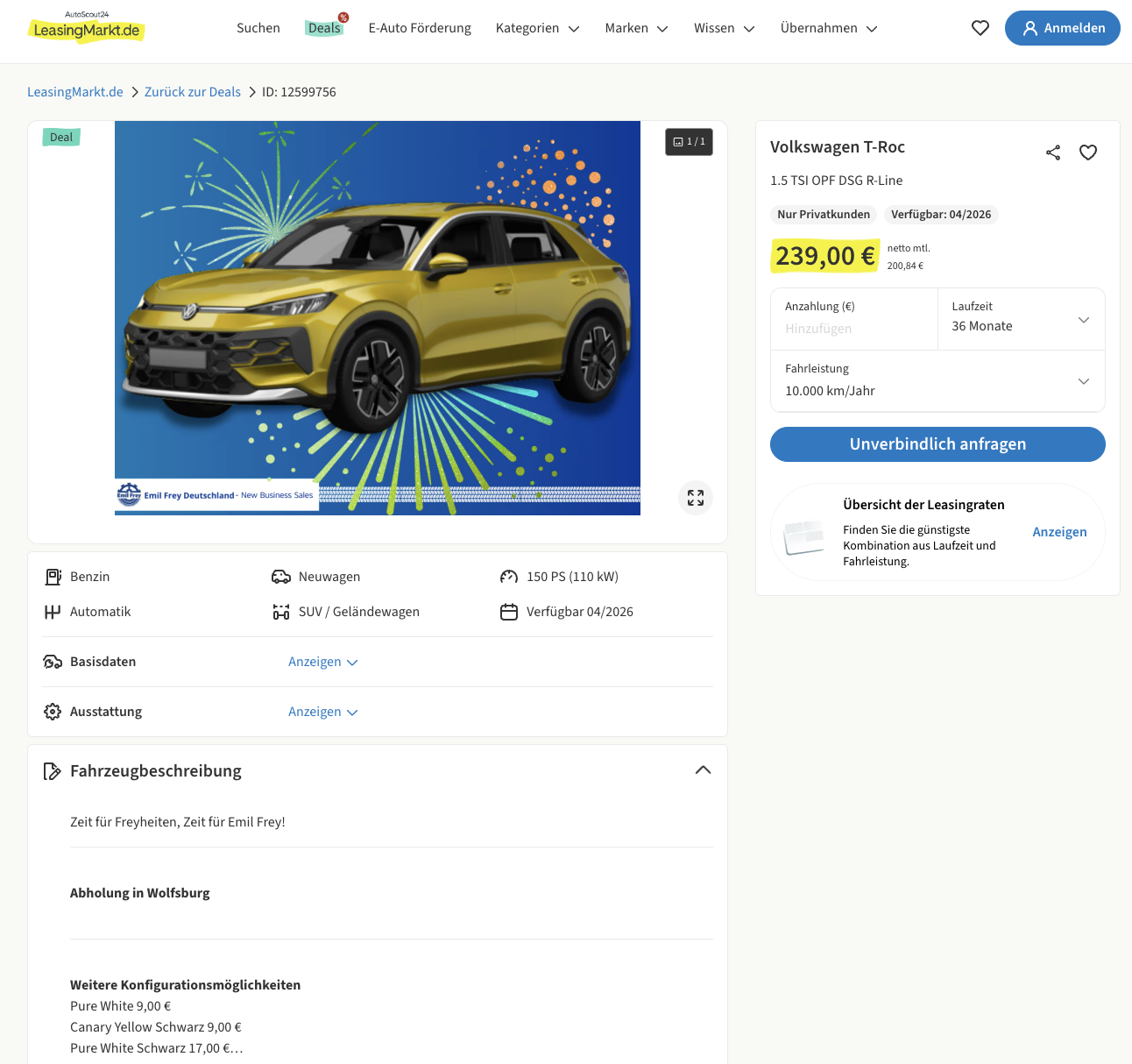 VW T-Roc Leasing für 239 Euro im Monat brutto [frei konfigurierbar]