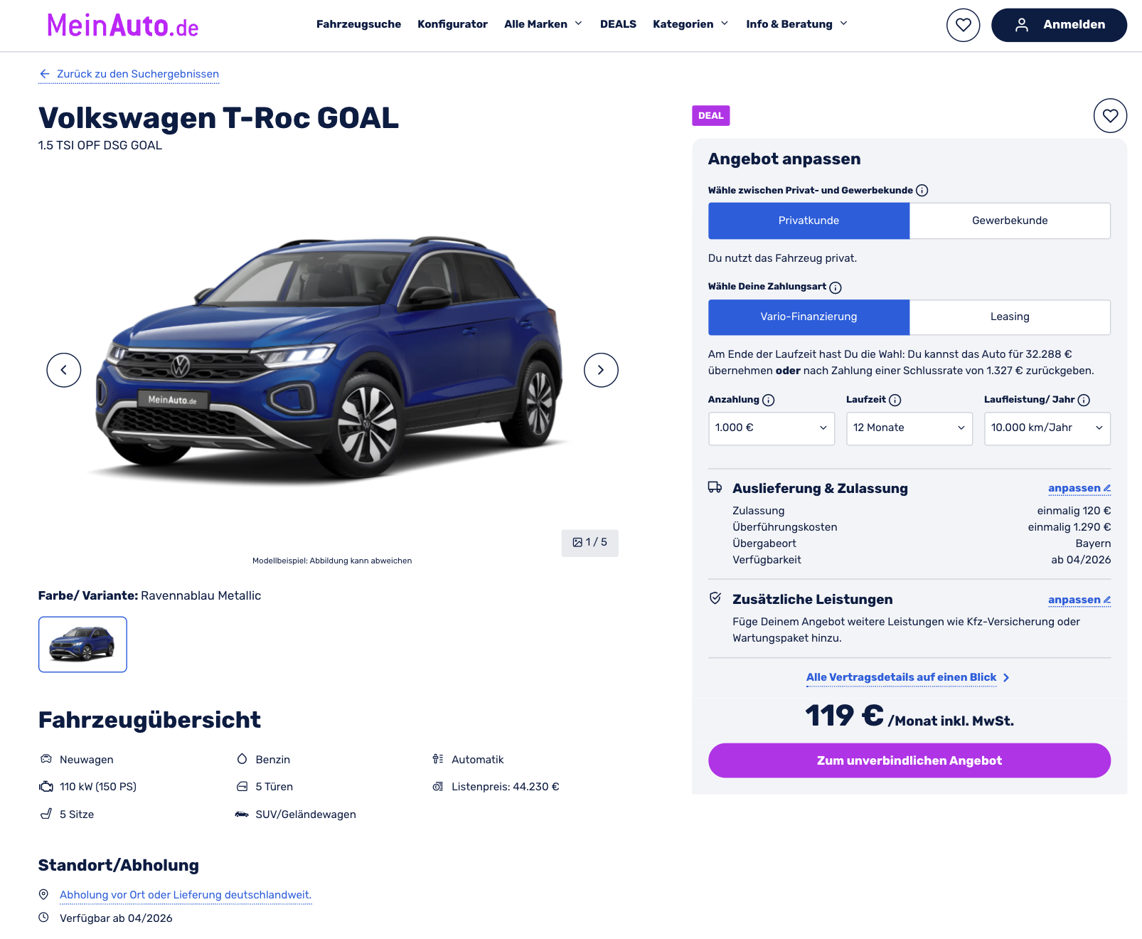 Ein Jahr lang ein beliebtes SUV fahren, ohne sich jahrelang festzulegen, genau dafür ist dieses Angebot gemacht. Sichert euch den VW T-Roc 1.5 TSI 110 kW DSG Goal bei MeinAuto für 119 Euro brutto pro Monat, kalkuliert mit einer Sonderzahlung von 1.000 Euro. Es geht um das Vorfacelift Modell, bereits bestellt in Ravennablau Metallic erhältlich und mit üppiger Ausstattung. Kalkuliert ist das Angebot mit 12 Monaten Laufzeit und 10.000 Kilometern pro Jahr.