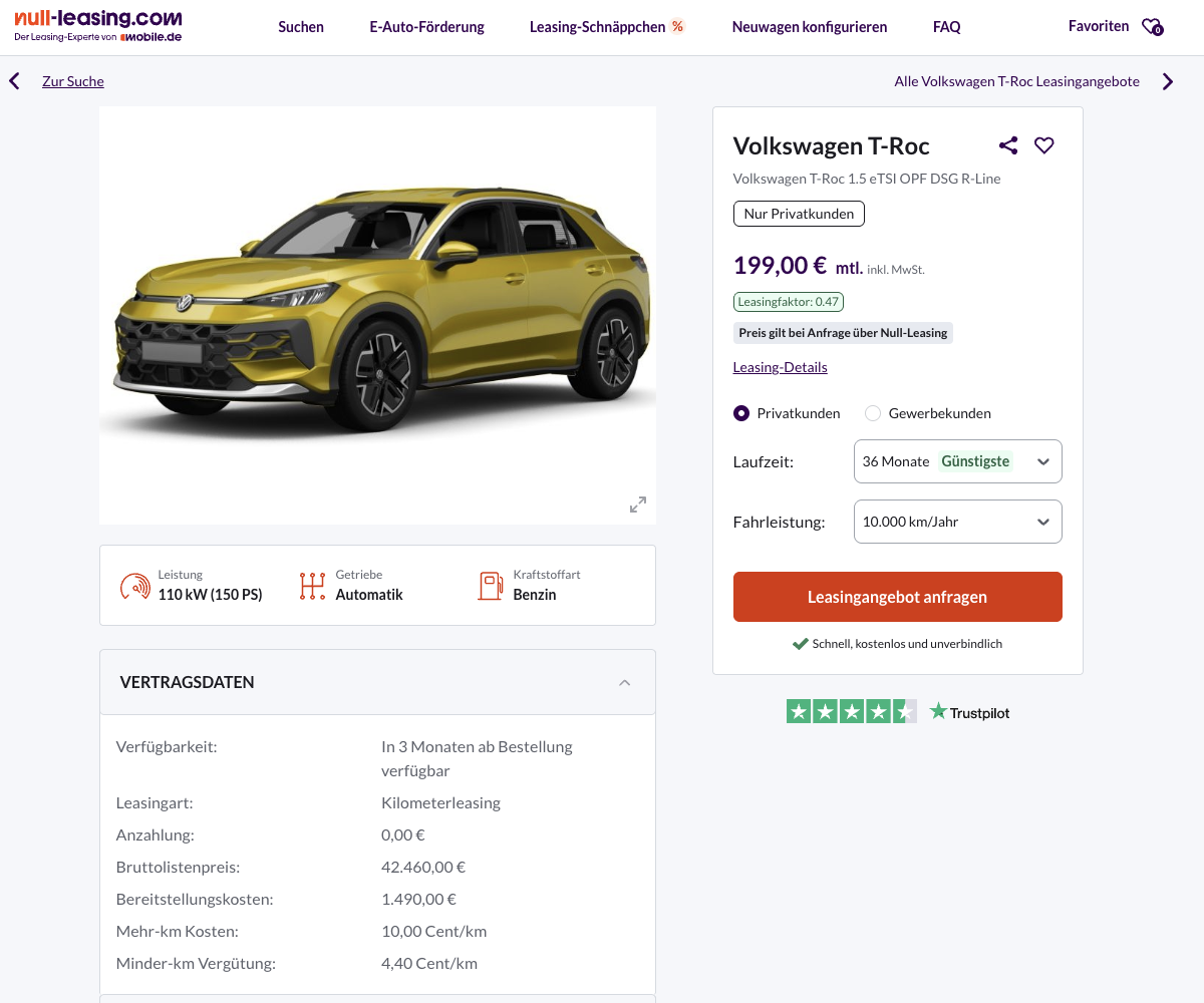 Gerechnet wurde das Privatleasing mit 36 Monaten Laufzeit und 10.000 Kilometern pro Jahr, Anpassungen sind meist möglich. Wirklich spannend wird es im Marktvergleich. Für ähnlich konfigurierte VW T-Roc R-Line Modelle werden andernorts teils rund 440 Euro brutto pro Monat aufgerufen. Genau deshalb stechen die 199 Euro brutto hier so deutlich heraus. Dieses Angebot funktioniert nicht nur über den Preis, sondern auch darüber, dass das Gesamtpaket stimmig wirkt.