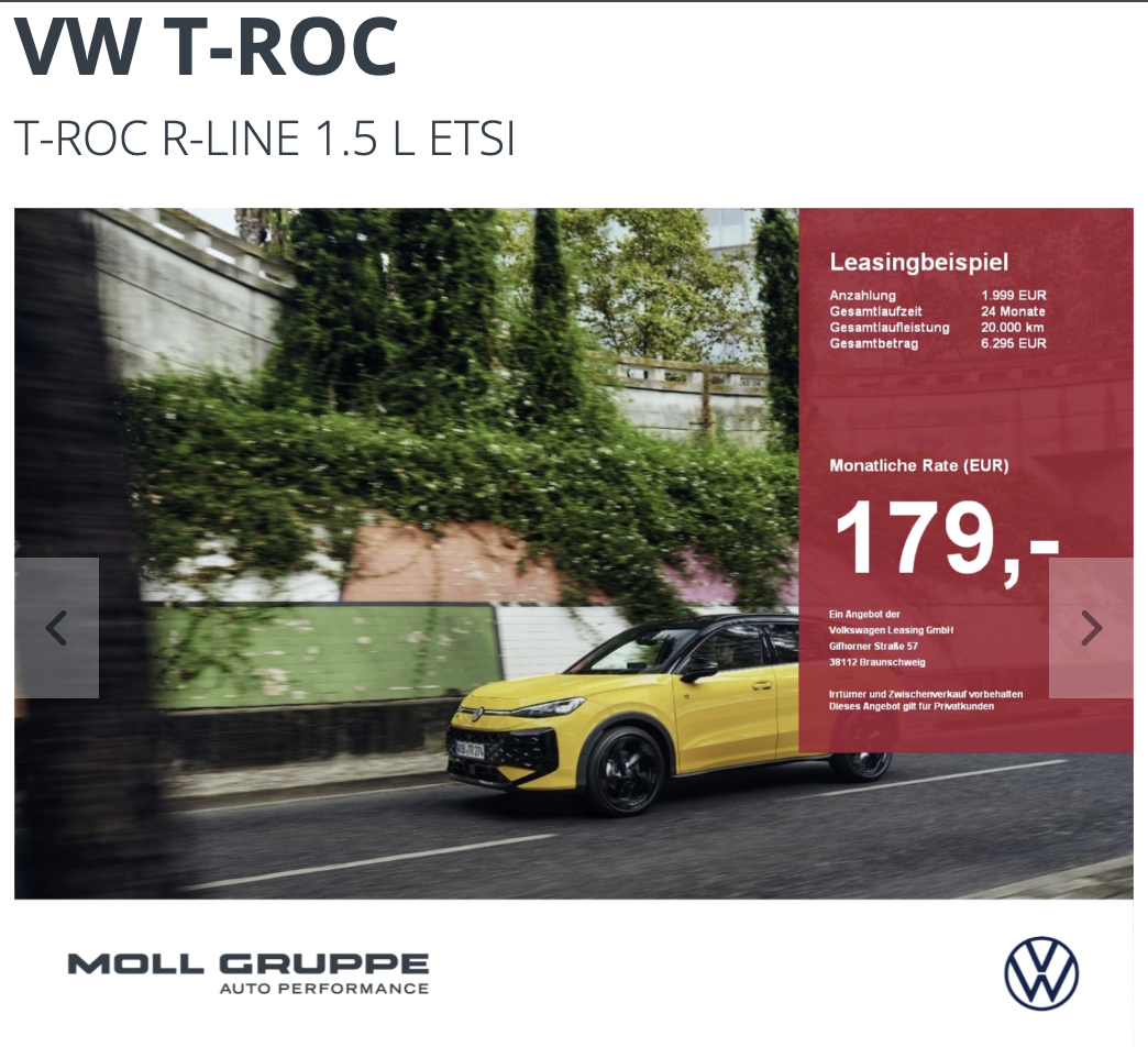 Im Marktvergleich wird es besonders interessant. Ähnlich konfigurierte VW T-Roc R-Line Modelle kosten andernorts teilweise über 300 Euro brutto pro Monat – bei gleicher Anzahlung. Daher stechen die 179 Euro brutto hier deutlich hervor. Die Lieferzeit beträgt laut Moll 120 Tage.