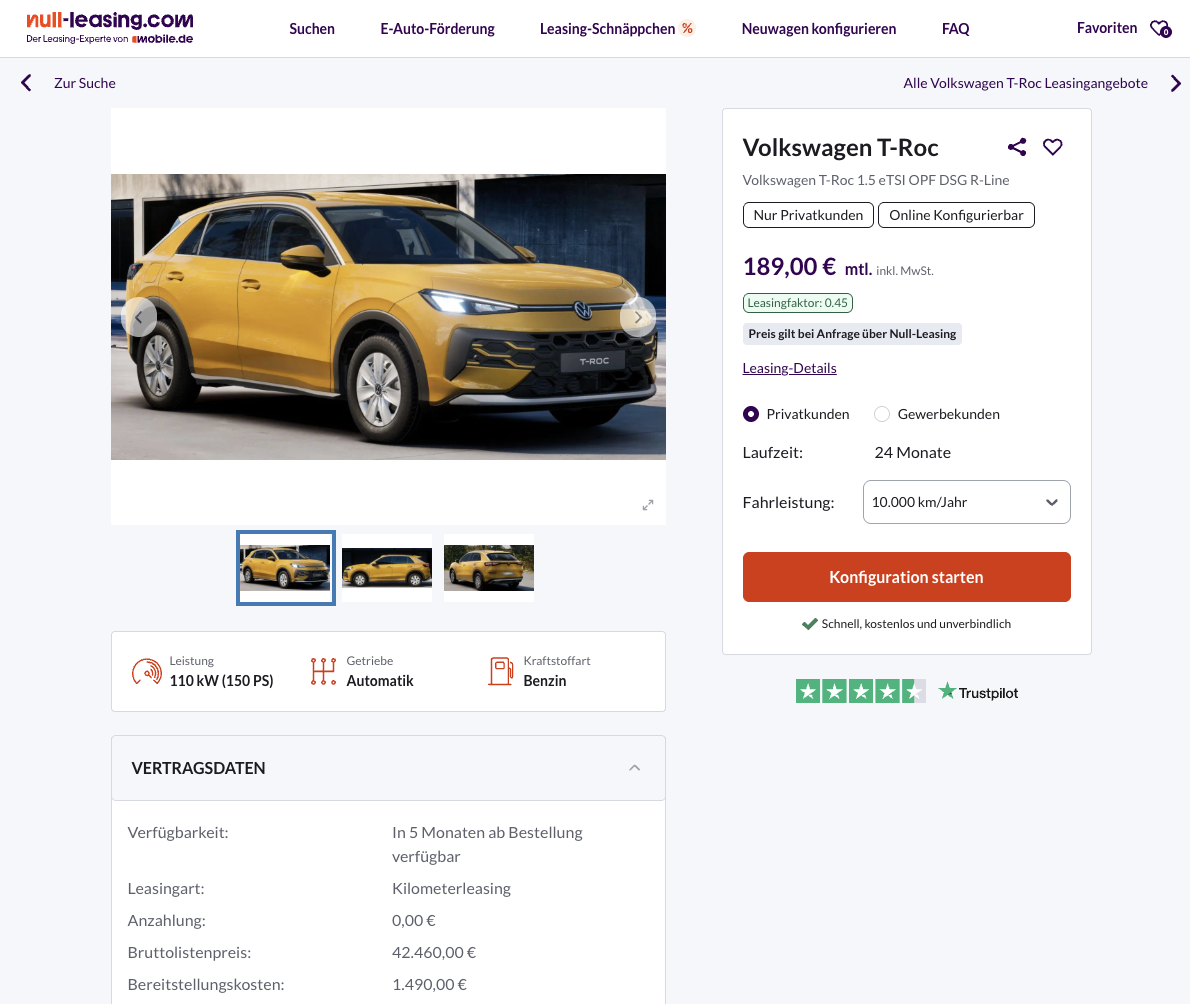 Das Privatleasing wurde mit 24 Monaten Laufzeit und 10.000 Kilometern pro Jahr kalkuliert, Anpassungen sind möglich. Besonders interessant wird der Deal im Vergleich. Während ähnliche Angebote aktuell bei rund 397 Euro brutto im Monat liegen, kostet dieser T-Roc nur 189 Euro.