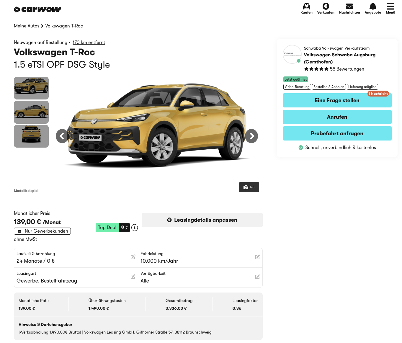 Der VW T-Roc gehört seit Jahren zu den festen Größen im Segment der kompakten SUVs. VW T-Roc 1.5 eTSI OPF DSG Style bei carwow für 139 Euro netto im Monat fällt dabei vor allem durch seinen Preis auf. Das Angebot richtet sich an Geschäftskunden und basiert auf einem frei konfigurierbaren Bestellfahrzeug. Die aktuelle Lieferzeit liegt bei etwa drei bis vier Monaten.