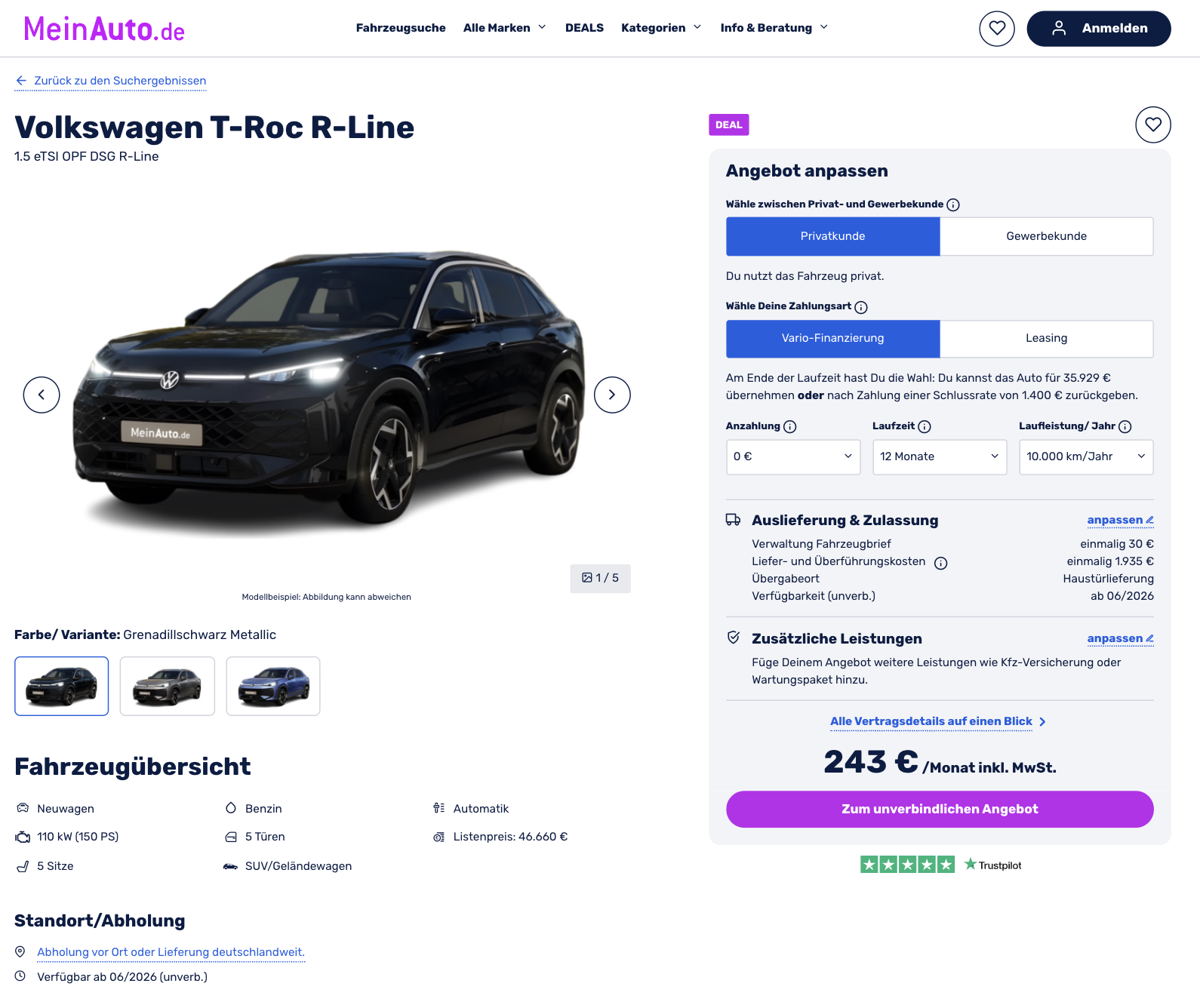 Der VW T‑Roc zählt seit Jahren zu den festen Größen im Segment und genau das macht dieses Angebot interessant. VW T-Roc 1.5 eTSI DSG R-Line bei MeinAuto für 243 Euro brutto im Monat im Vario-Leasing bringt ein gut ausgestattetes Kompakt-SUV in eine flexible Kalkulation. Der Wagen ist bereits bestellt und ab Juni in Grenadillschwarz, Wolf Grey oder Celestial Blue verfügbar.
