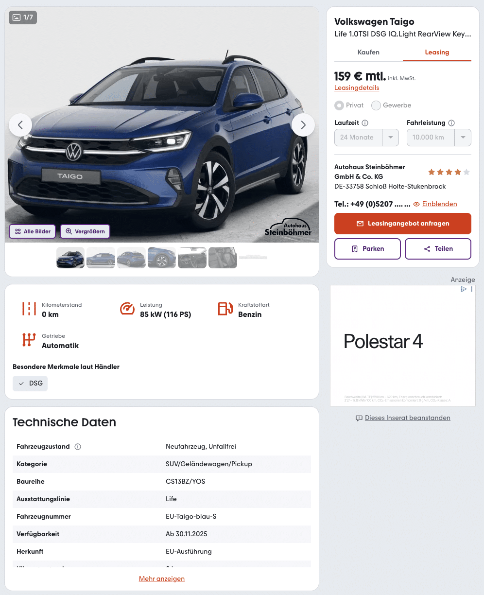 Für alle, die ein dynamisches Crossover suchen. Bei mobile.de gibt es den VW Taigo R-Line für nur 159 Euro brutto pro Monat im Privatleasing. Das Fahrzeug ist bereits bestellt, kommt in Reef Blue Metallic und ist ab Dezember 2025 verfügbar. Mit einem Leasingfaktor von 0,45 ist der Deal preislich kaum zu schlagen, sportlicher Auftritt inklusive.