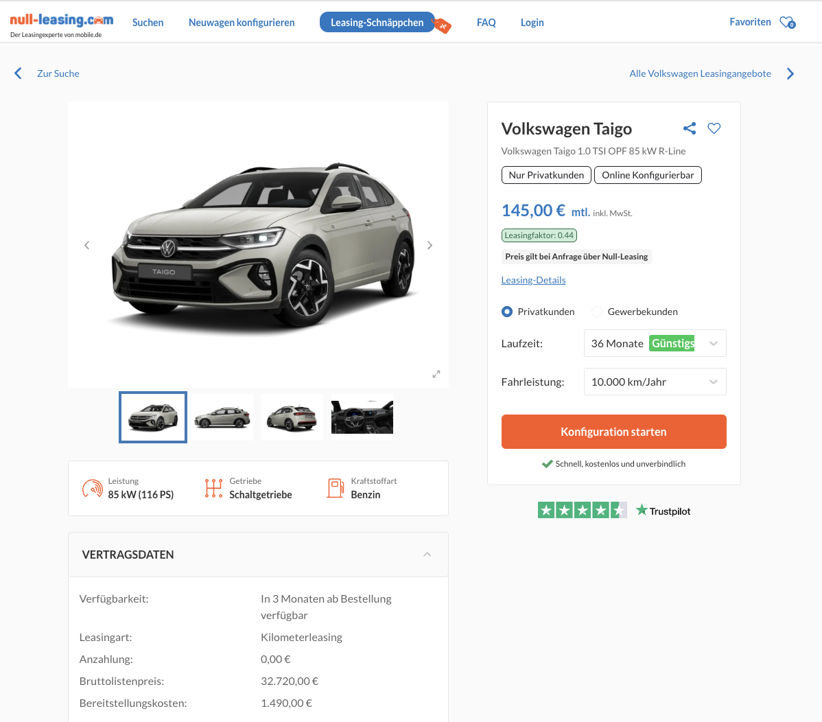 Mit einem Leasingfaktor von 0,44 startet der VW Taigo 1.0 TSI OPF 85 kW R-Line bei Null-Leasing für 145 Euro im Monat brutto in eine Liga, die sonst deutlich teurer besetzt ist. Angeboten wird ein frei konfigurierbares Bestellfahrzeug, das sich exakt nach den eigenen Vorstellungen zusammenstellen lässt, von Farbe bis Ausstattung. Die angegebene Lieferzeit von rund drei Monaten bleibt dabei angenehm überschaubar und macht den Deal auch für kurzfristige Planungen interessant.