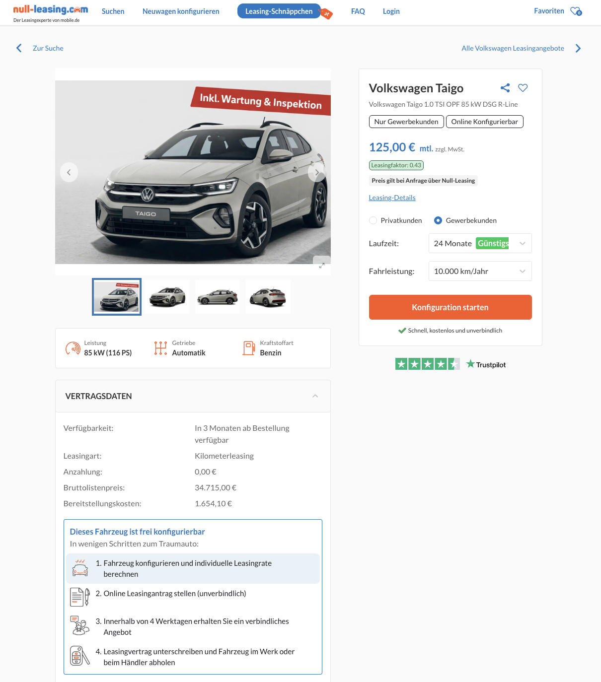 Kompakt, dynamisch und konsequent auf Alltag und Wirtschaftlichkeit ausgelegt, trifft der Taigo genau den Nerv von Geschäftskunden. Bei Null-Leasing gibt es den VW Taigo 1.0 TSI OPF 85 kW DSG R-Line für 125 Euro netto pro Monat inklusive Service-Paket mit Wartung und Inspektion. Der Leasingfaktor von 0,43 unterstreicht das starke Preis-Leistungs-Verhältnis. Es handelt sich um ein frei konfigurierbares Bestellfahrzeug, das sich individuell zusammenstellen lässt, mit einer Lieferzeit von rund drei Monaten.