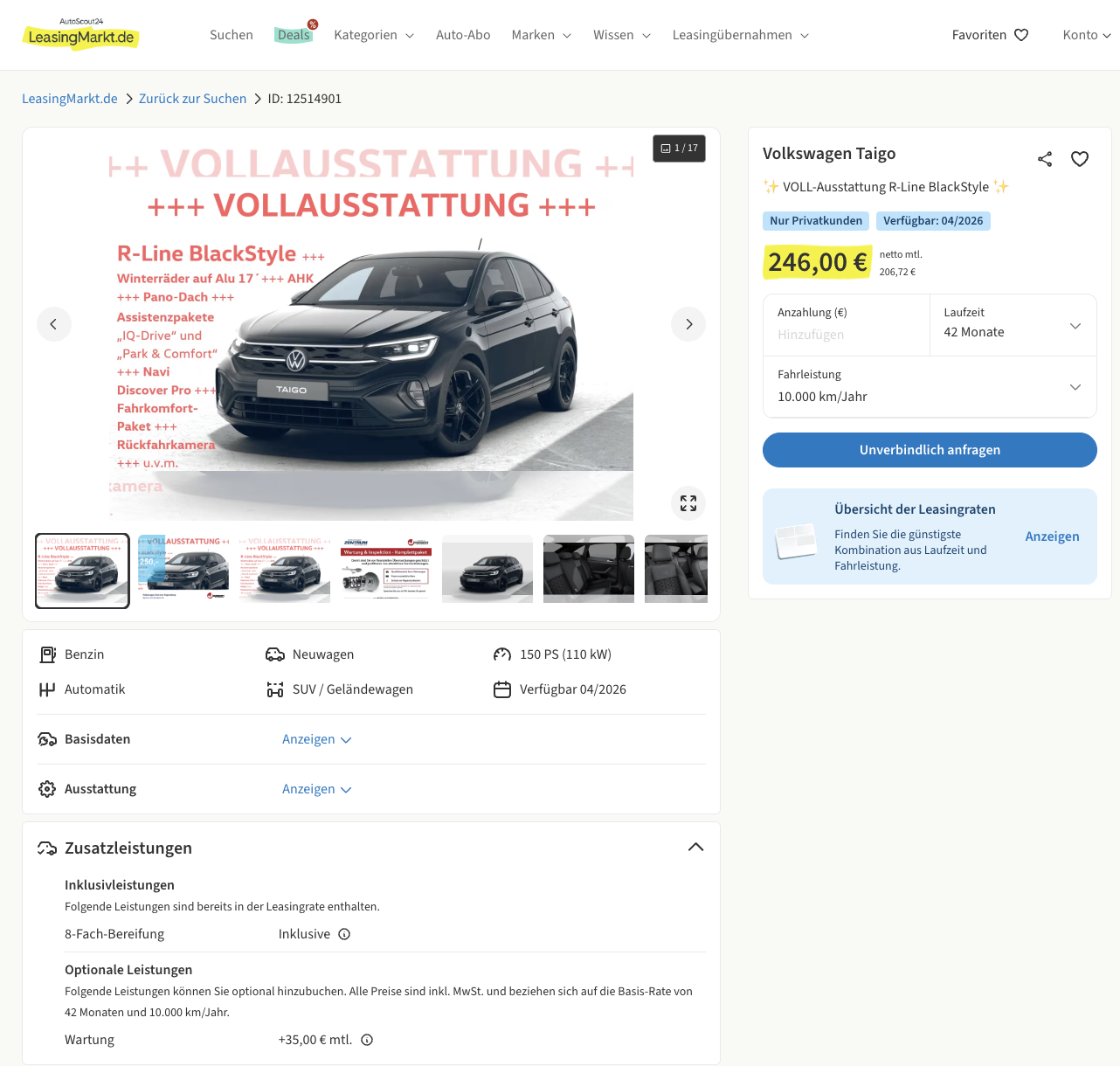 Kalkuliert ist das Leasingangebot mit 42 Monaten Laufzeit und 10.000 Kilometern pro Jahr, Anpassungen sind in der Regel möglich. Besonders deutlich wird der Deal im Marktvergleich, denn beim Platzhirsch wird der VW Taigo laut Angabe aktuell mit 487 Euro brutto pro Monat angeboten. Damit liegt dieses Angebot fast 50 Prozent darunter, trotz sehr umfangreicher Ausstattung.