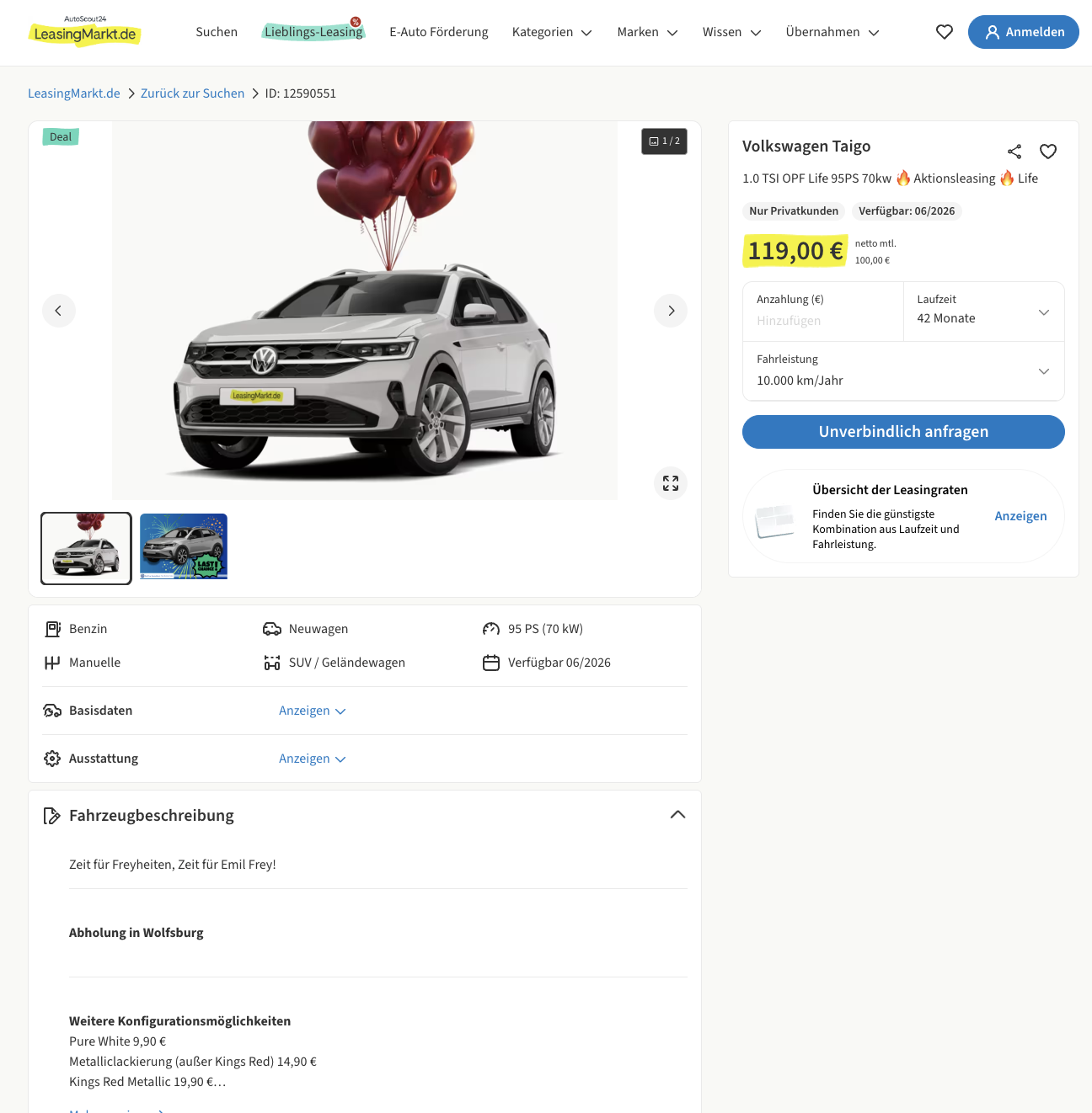 Hier kommt das kleinste SUV von Volkwagen, der Taigo. Privatkunden können den VW Taigo 1.0 TSI OPF 70 kW Life bei LeasingMarkt für 119 Euro brutto im Monat, als frei konfigurierbares Bestellfahrzeug. Farbe, Details und Ausstattung lassen sich passend zusammenstellen, die geplante Auslieferung ist für Juni 2026 vorgesehen. Wer früh plant, bekommt hier ein Angebot, das preislich deutlich unter dem liegt, was sonst im Markt aufgerufen wird.