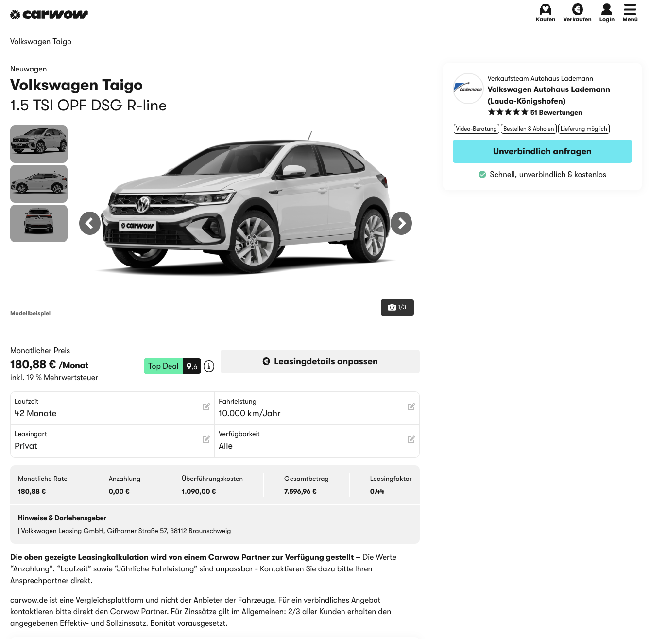 Die Beispielrechnung basiert auf 42 Monaten Laufzeit und 10.000 Kilometern jährlich. Im Marktvergleich werden für den Taigo rund 412 Euro brutto pro Monat verlangt. Mit 180,88 Euro brutto positioniert sich dieses Angebot deutlich darunter.