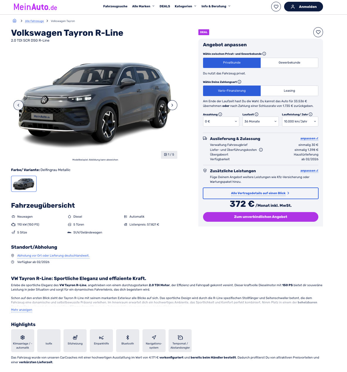 Der Tayron ist das große Volkswagen SUV für lange Strecken, viel Gepäck und einen Auftritt, der seriös bleibt. Bei MeinAuto gibt es den VW Tayron 2.0 TDI SCR DSG R Line aktuell im Vario-Leasing für monatlich 372 Euro brutto. Nach 36 Monaten entscheidet ihr entspannt, ob ihr ihn für 33.536 Euro übernehmt oder nach Zahlung einer Schlussrate von 1.735 Euro zurückgebt. Das Fahrzeug ist bereits bestellt, üppig ausgestattet und soll im Februar 2026 ausgeliefert werden, dazu kommt die elegante Außenfarbe Delfingrau Metallic, die den Tayron besonders erwachsen wirken lässt.