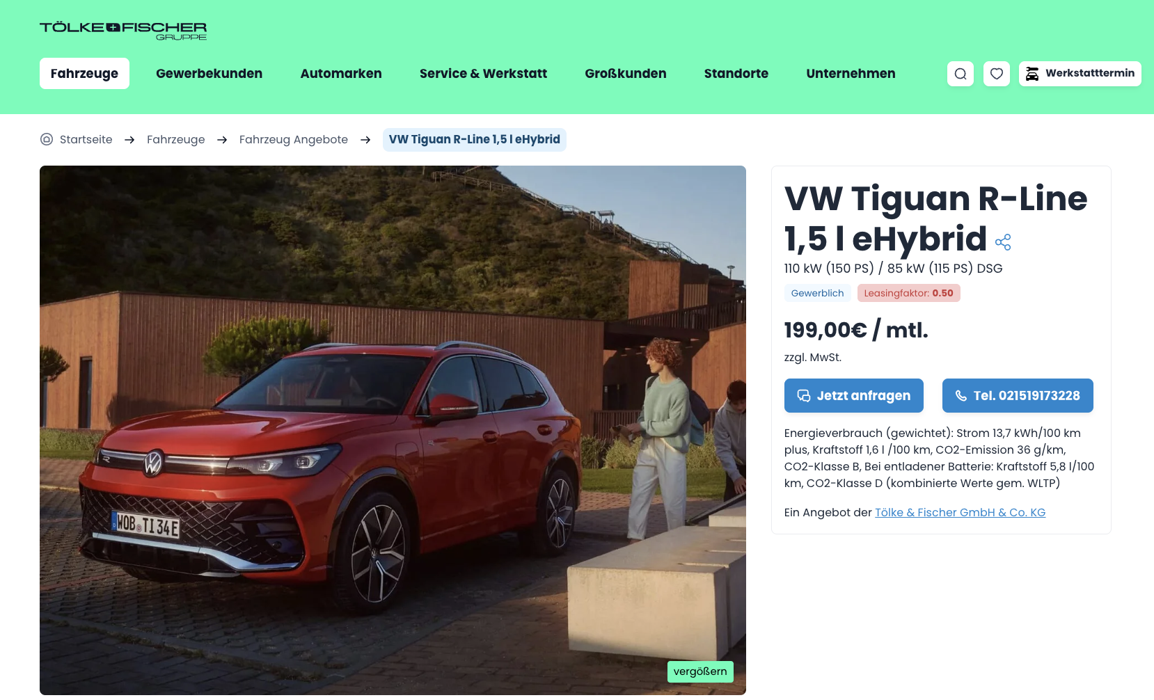 Elektrisch fahren, flexibel bleiben und dabei ein beliebtes Volkswagen-SUV bewegen. Den VW Tiguan 1.5 eHybrid OPF 110 kW DSG R-Line gibt es aktuell bei Tölke+Fischer für 199 Euro netto im Monat und bringt genau diese Kombination auf den Punkt. Das Angebot richtet sich an Geschäftskunden und basiert auf 1.599 Euro Sonderzahlung netto sowie 1.000 Euro Überführungskosten netto. Der Tiguan wird als frei konfigurierbares Bestellfahrzeug angeboten, wodurch sich Ausstattung und Lackierung individuell gestalten lassen. Die Auslieferung erfolgt über die Autostadt in Wolfsburg, was dem Gesamtpaket einen zusätzlichen Premium-Touch verleiht.