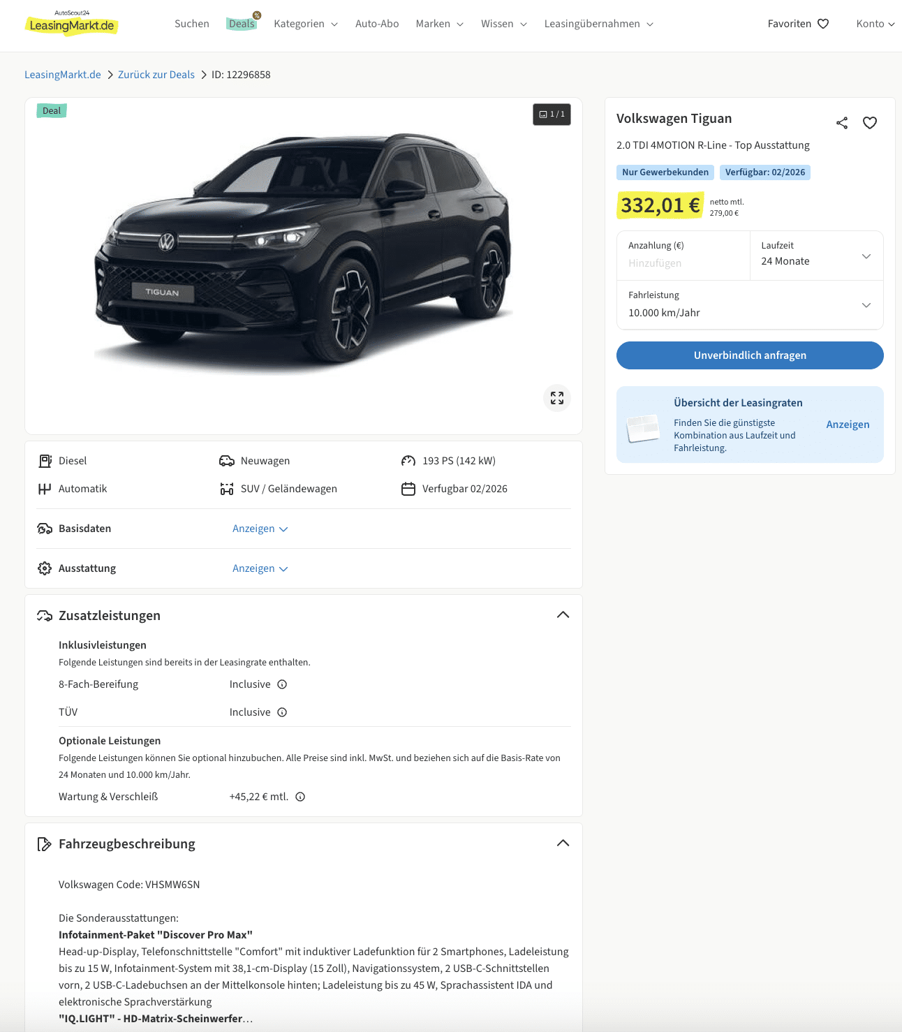 Der VW Tiguan 2.0 TDI 4MOTION DSG R-Line steht bei LeasingMarkt aktuell für 279 Euro netto im Monat im Geschäftsleasing bereit, ein echtes Top-Angebot für ein SUV dieser Klasse. Das Fahrzeug kommt 8-fach bereift und ist mit einer Ausstattung versehen, die kaum Wünsche offenlässt: Winterpaket „Premium“ inklusive Standheizung, das brillante „IQ.LIGHT“-HD-Matrix-Lichtsystem, das umfangreiche Infotainment-Paket „Discover Pro Max“ mit großem Touchdisplay sowie eine Vielzahl moderner Assistenzsysteme.