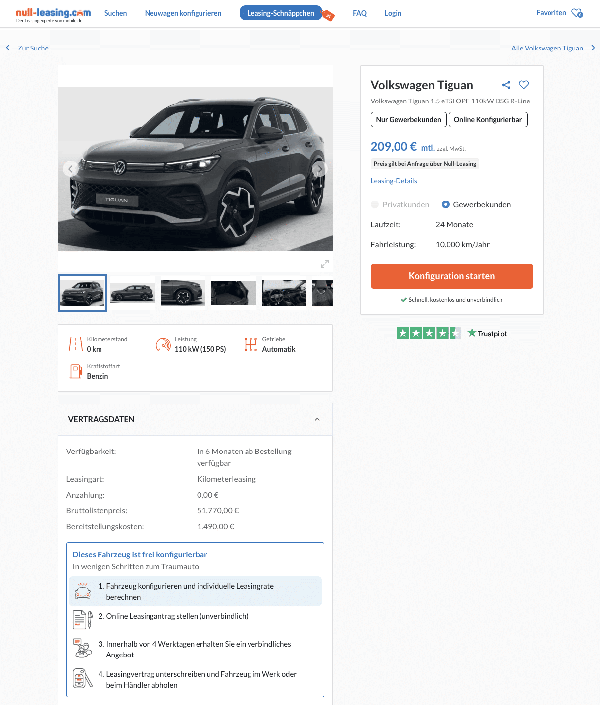 Unterm Strich bekommt ihr ein SUV mit VW Tiguan Typik, R-Line Schärfe und moderner MHEV Effizienz, zu einer Rate von 209 Euro netto, die im Vergleichsumfeld überzeugt und in der Excel-Spalte ebenso gut aussieht wie der Tiguan vor eurer Haustür. Viel Raum, starke Vernetzung, smarter Antrieb, so fühlt sich ein zeitgemäßes Leasingpaket an.