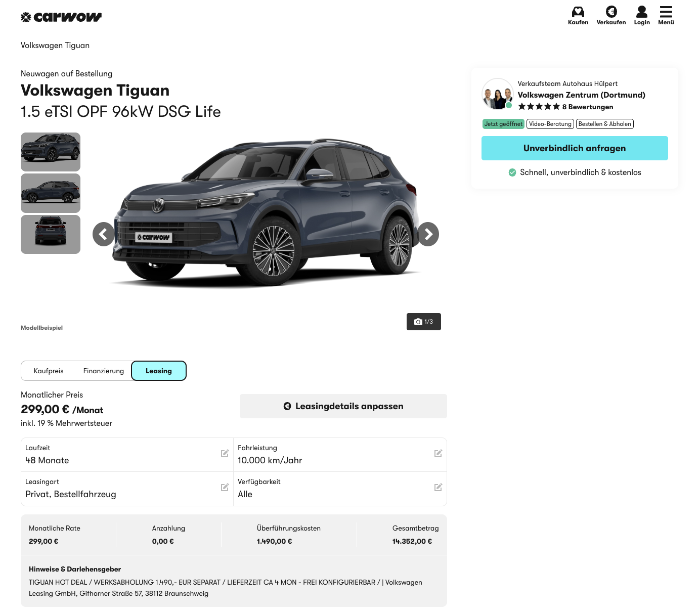 Kalkuliert wurde das Angebot mit 48 Monaten Laufzeit und 10.000 Kilometern pro Jahr, Anpassungen sind in der Regel möglich. Besonders interessant wird der Deal im Marktvergleich. Während der Platzhirsch für einen vergleichbaren VW Tiguan aktuell rund 450 Euro brutto pro Monat verlangt, liegt dieses Angebot mit 299 Euro brutto deutlich darunter.