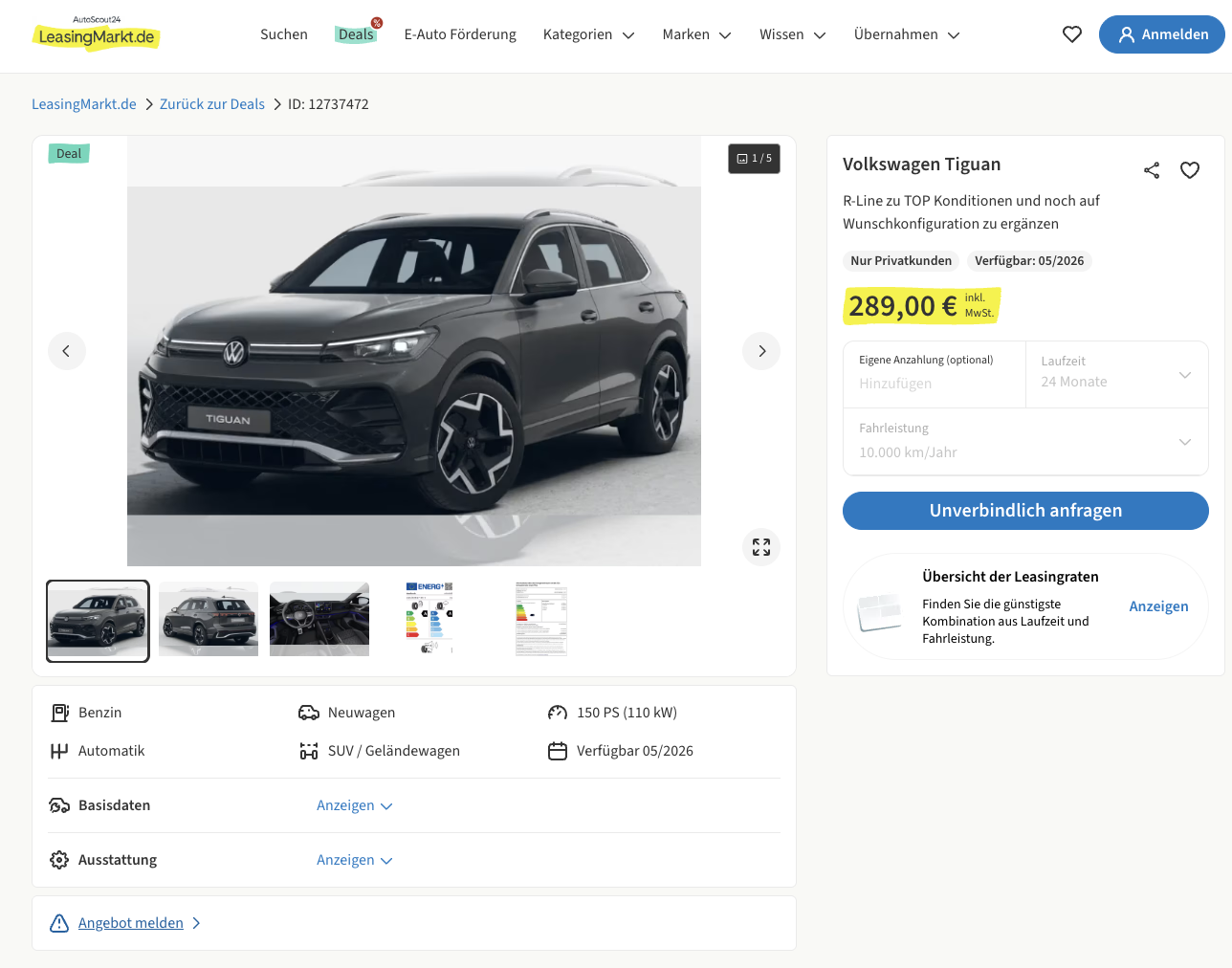 Die Konditionen basieren auf 24 Monaten Laufzeit und 10.000 Kilometern pro Jahr. Besonders auffällig wird das Angebot im direkten Vergleich, denn ein ähnlich ausgestatteter Tiguan liegt beim Marktführer aktuell bei rund 721 Euro brutto im Monat. Mit 289 Euro positioniert sich dieser Deal damit deutlich darunter und gehört zu den interessanteren Optionen im Segment.