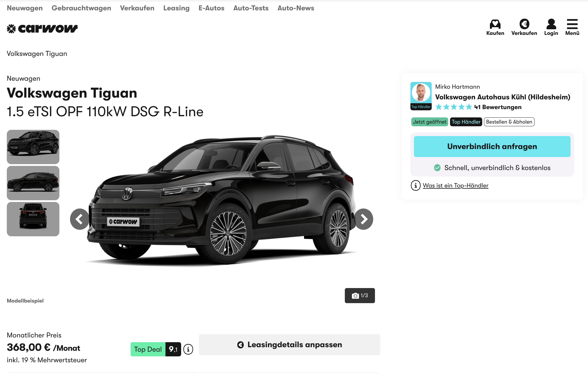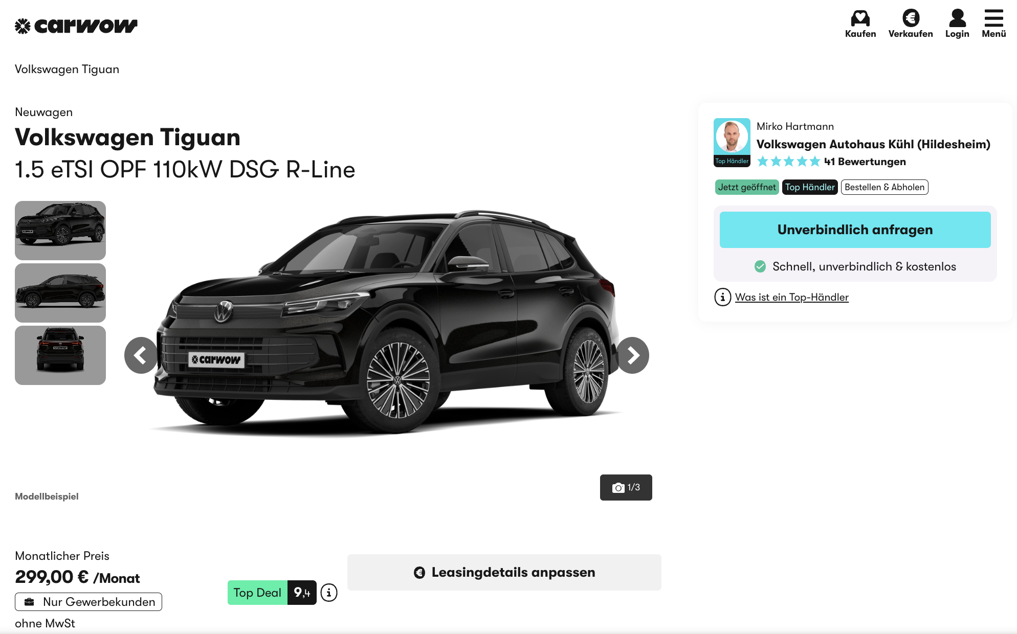 Dieser VW ist nahezu vollausgestattet! Carwow hat den VW Tiguan 1,5 eTSI OPF 110 kW DSG R-Line sowohl für Privat– als auch für Geschäftskunden im Angebot. Im Privatleasing ist das SUV bereits ab 368 Euro brutto pro Monat erhältlich. Geschäftskunden profitieren von einem noch attraktiveren Angebot mit einer monatlichen Rate von 299 Euro netto. Das Fahrzeug befindet sich im Vorlauf, die Lieferzeit beträgt etwa 4 Wochen.