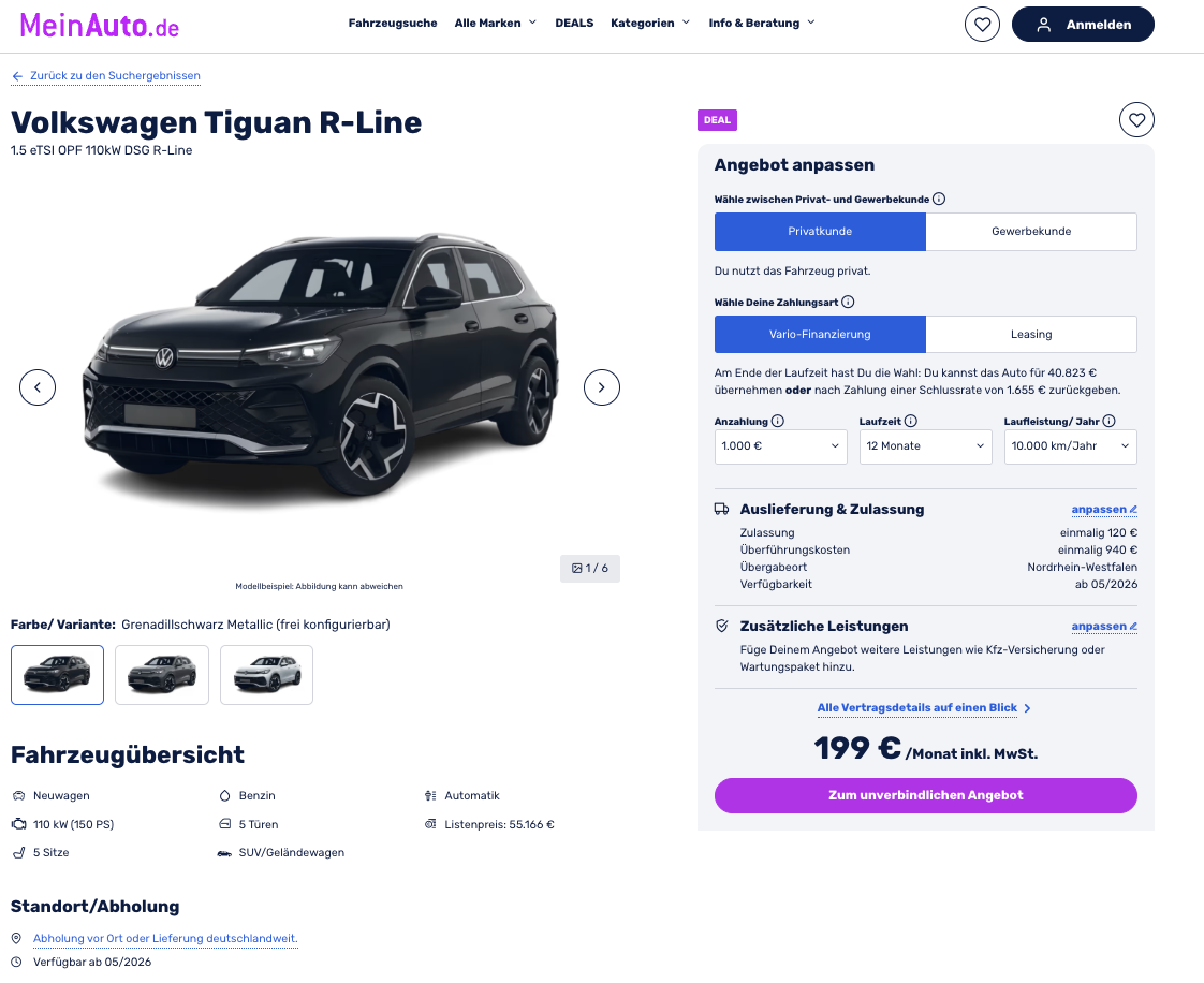Der Tiguan ist seit Jahren das Maß der Dinge im SUV-Segment von Volkswagen, und genau deshalb ist dieses Angebot so interessant. Bei MeinAuto gibt es den VW Tiguan 1.5 eTSI OPF 110 kW DSG R-Line für 199 Euro brutto im Monat als Vario-Leasing, für maximale Flexibilität. Kalkuliert wurde das Angebot mit 1.000 Euro Anzahlung, einer Laufzeit von 12 Monaten und 10.000 Kilometern Fahrleistung. Am Ende bleibt die Entscheidung offen. Der Tiguan kann entweder gegen eine Schlussrate von 1.655 Euro zurückgegeben oder für 40.823 Euro brutto übernommen werden. Es handelt sich um ein frei konfigurierbares Bestellfahrzeug, die Auslieferung ist für Mai 2026 geplant.