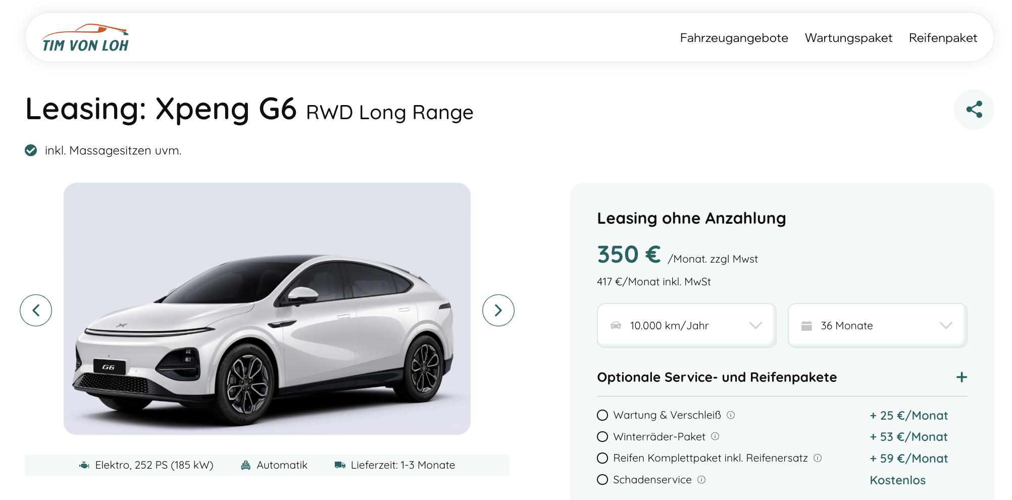 Elektro-SUV mit Premium-Anspruch zum überraschend starken Kurs! XPENG G6 RWD Long Range bei Tim von Loh für 350 Euro netto im Monat zeigt genau das und positioniert sich klar als ernsthafte Alternative zu etablierten Marken. Wer noch mehr Leistung sucht, greift zur AWD Performance-Version für 379 Euro netto, die das Konzept noch einmal deutlich sportlicher auslegt. In beiden Fällen handelt es sich um ein frei konfigurierbares Bestellfahrzeug, das sich individuell anpassen lässt.
