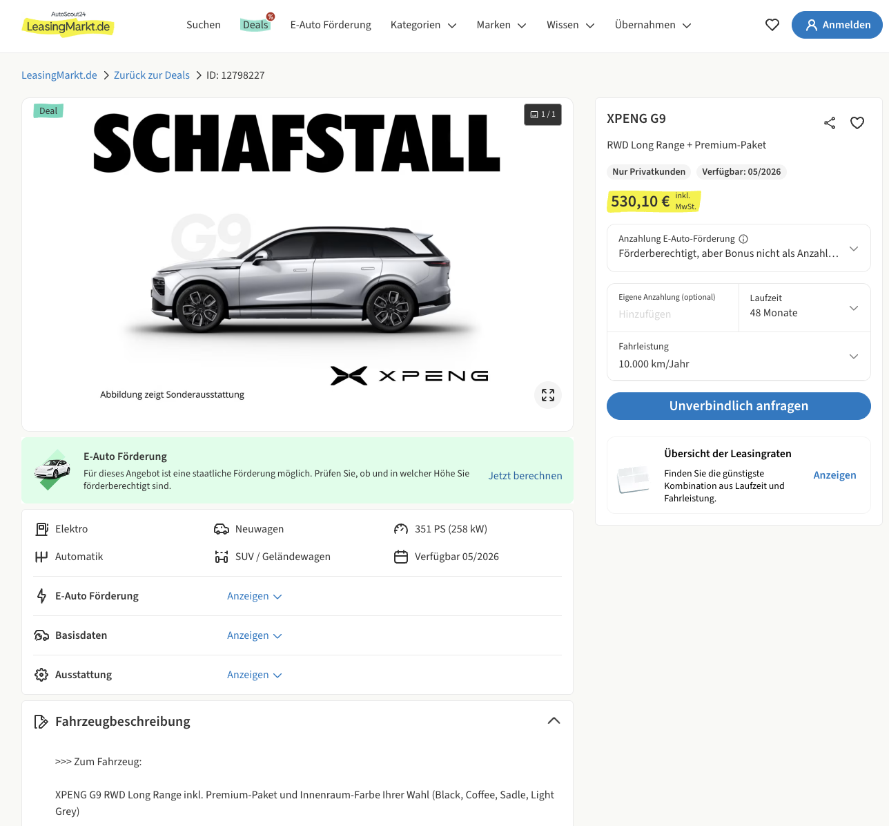 Die Kalkulation basiert auf 48 Monaten Laufzeit und 10.000 Kilometern pro Jahr. Besonders auffällig bleibt die aktuelle Marktsituation, während viele Plattformen XPENG noch gar nicht führen, ist dieses Angebot bereits verfügbar und positioniert sich damit als früher Einstieg in ein neues Premium-Elektro-SUV.