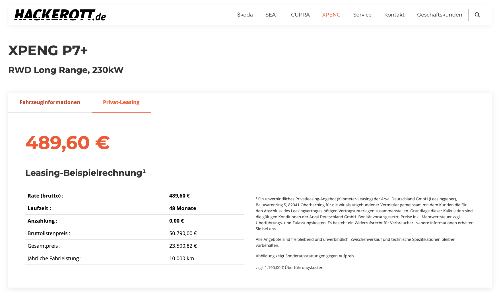 Die Kalkulation basiert auf 48 Monaten Laufzeit und 10.000 Kilometern pro Jahr. Für die Überführung fallen 1.190 Euro an.